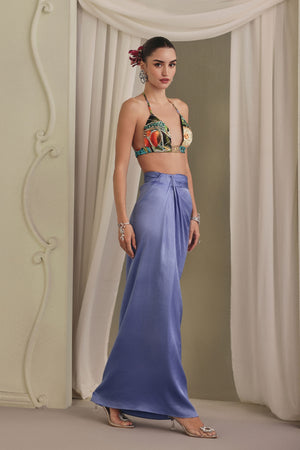 • This pastel silk blue drape skirt exudes effortless elegance with its soft sheen and graceful fall. Paired with a hand-embroidered bustier featuring sequin detailing and vibrant hues,the rich embroidery and contemporary silhouette create a look that’s both festive and fashion-forward a statement of refined charm and modern glamour.