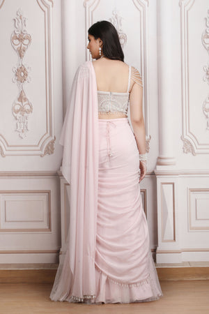 • Radiate grace in this blush pink pre-draped saree featuring a sheer embellished skirt with delicate sequin work and a sculpted, embroidered blouse. The soft drape and subtle shimmer lend an ethereal quality to the ensemble, making it perfect for evening soirees, cocktail parties, or modern wedding celebrations.