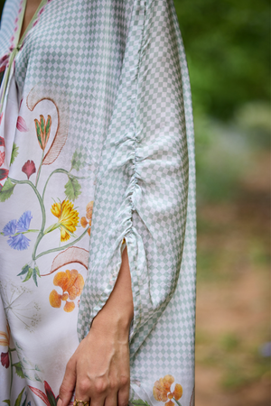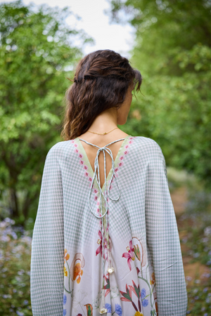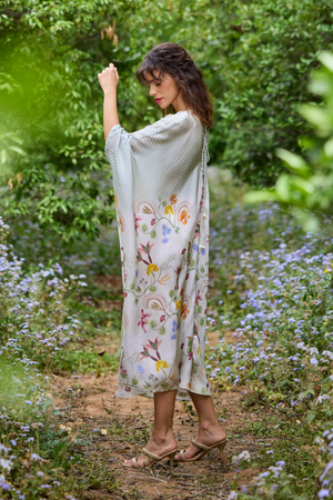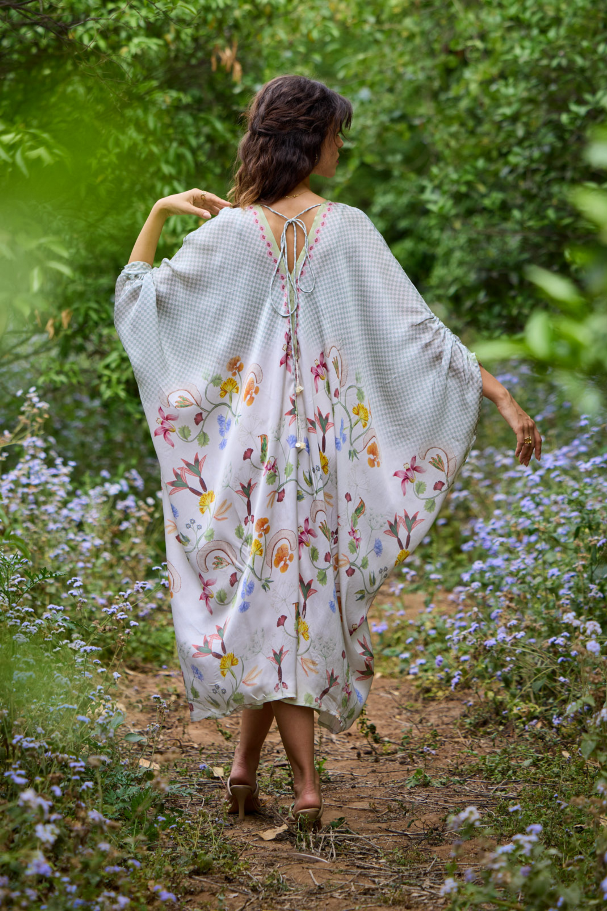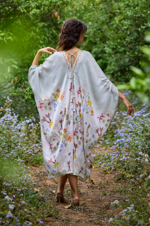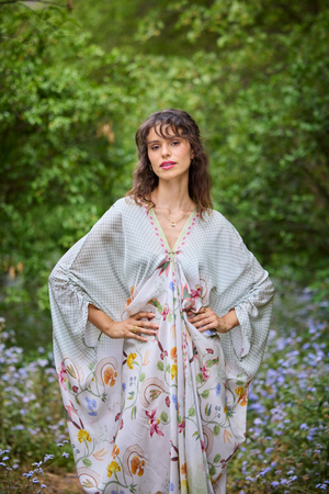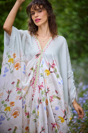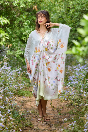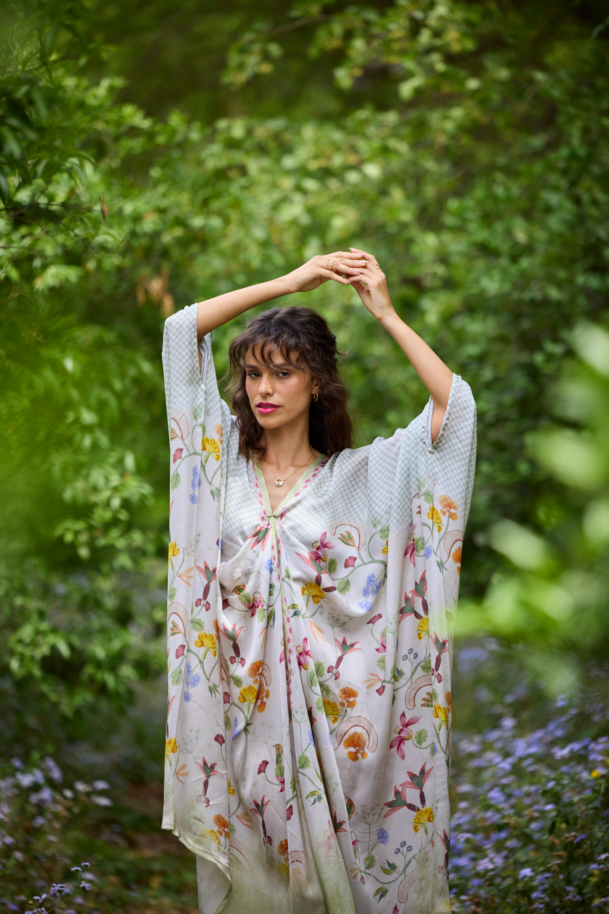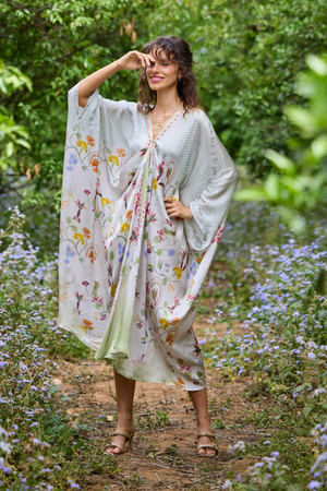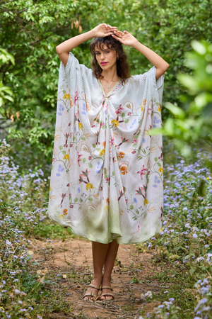 • This flowing kaftan dress has a relaxed fit with a pleated front, a V neckline and a long String on Back for closure. Wear yours with sandals from lunch al-fresco to night time cocktails. Stadard dress length : 48" Other attributes: Fabric: Vegan silk satin Digitally printed Unlined