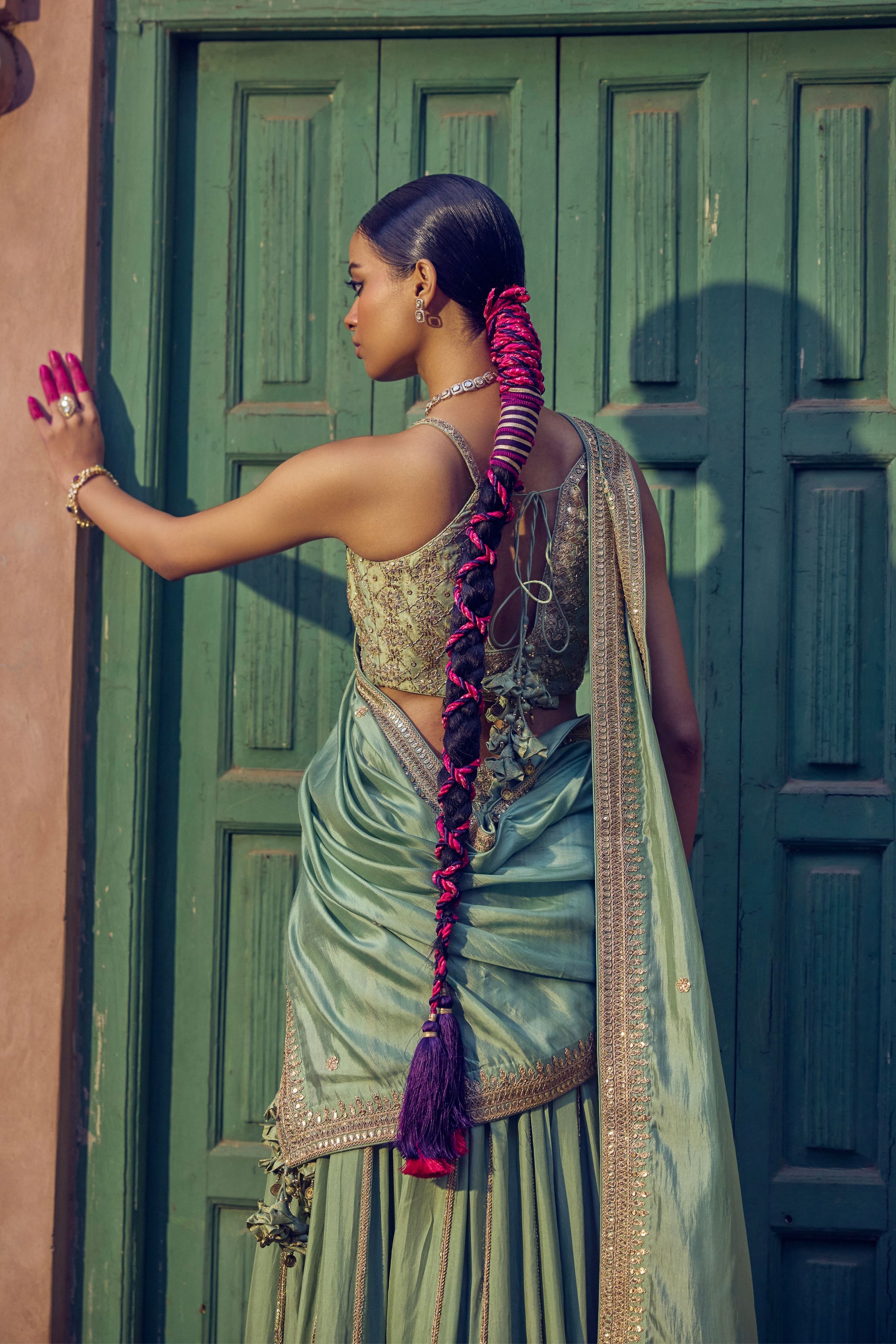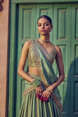 • Our classic sage lehenga set with gota marodi work paired with blouse and dupatta