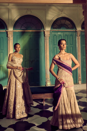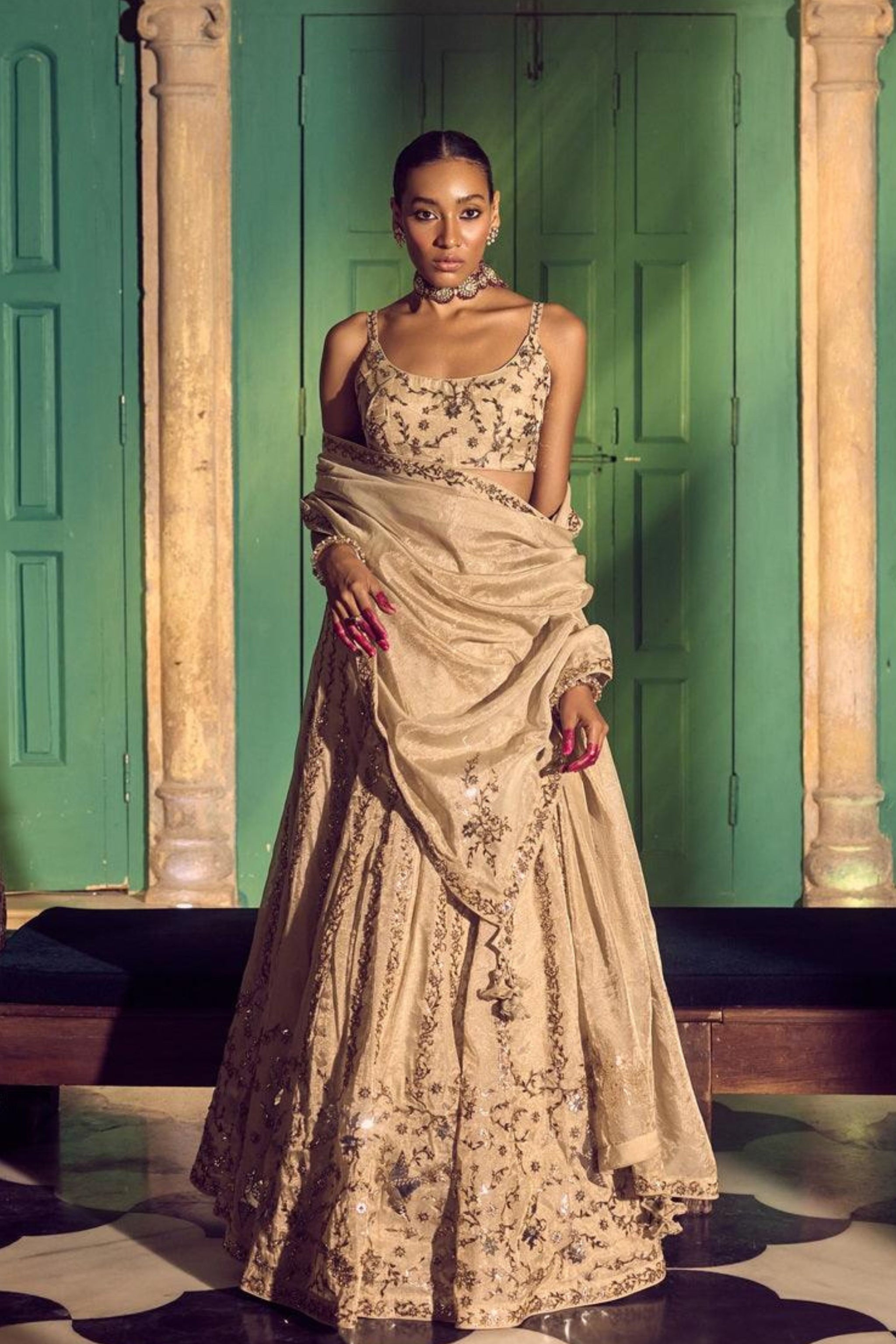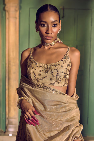 • The rani sa lehenga from our couture capsule is meant to make you feel like rajasthan's royalty. The gold tissue lehenga is enriched with patra ka kaam and dori accents, exuding unmatched regal opulence. The entire set is a blend of grandeur with comfort by using lightweight materials and exquisite embellishments.
