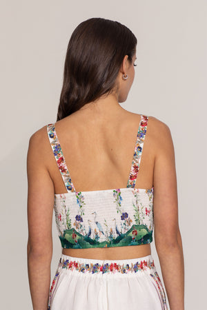 • Featuring ranna gill's layla bustier made in breathable cotton, it brings a fresh take to florals with the ivory lilacs print blooming across its cropped silhouette. The square neckline and sleeveless straps carry the same floral artwork, creating a cohesive story. Highlighted with a scenic landscape print panel at the hem, this piece pairs perfectly with the alvia culottes pants for a coordinated look.