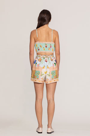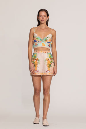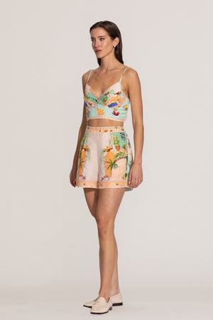 • Featuring ranna gill's lillian shorts which embody easy elegance with a lively amalfi print, where  fruits, florals come together in a symphony of mediterranean hues. Crafted from linen-viscose, these high-waisted shorts offer a relaxed fit with soft pleats and side pockets for functionality. The structured waistband highlights the silhouette, while the fluid fabric ensures comfort. Finished in a vibrant multi-color palette, these shorts are designed to transition effortlessly from daytime adventures to chic evenings.