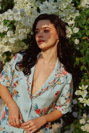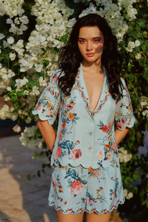 • Ranna gill's liora scalloped button down shirt is designed in a breezy crinkle fabric, offering comfort with a glam touch. Drenched in the jade rose print, it features an artistic display of blooming roses in vibrant hues. The notched collar lends a structured appeal, while the scalloped hem and sleeves add a soft, playful finish. Delicate button closures enhance its easygoing charm, making it a versatile pick for any wardrobe. Perfect for pairing with matching fiora shorts or styling as a statement top.