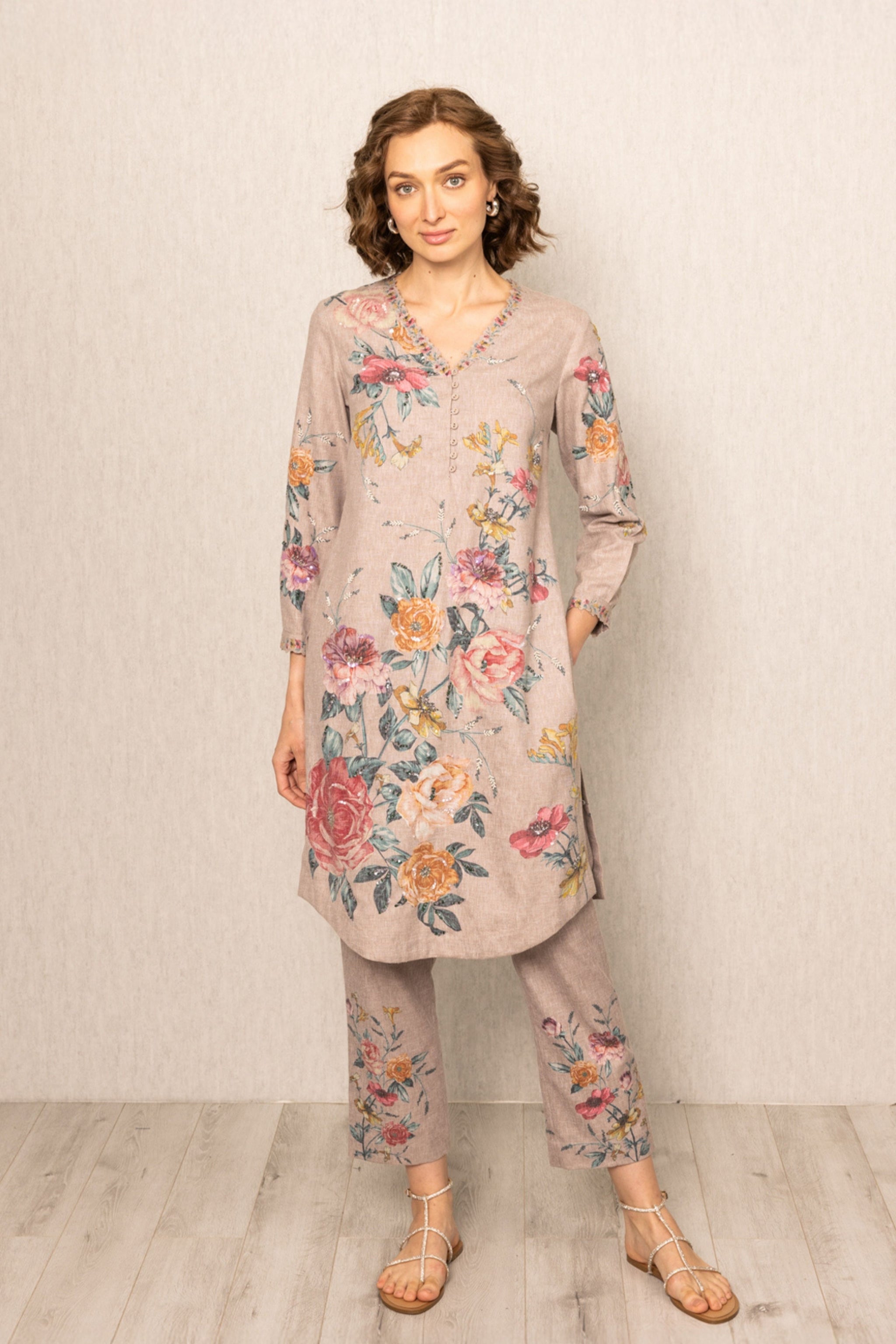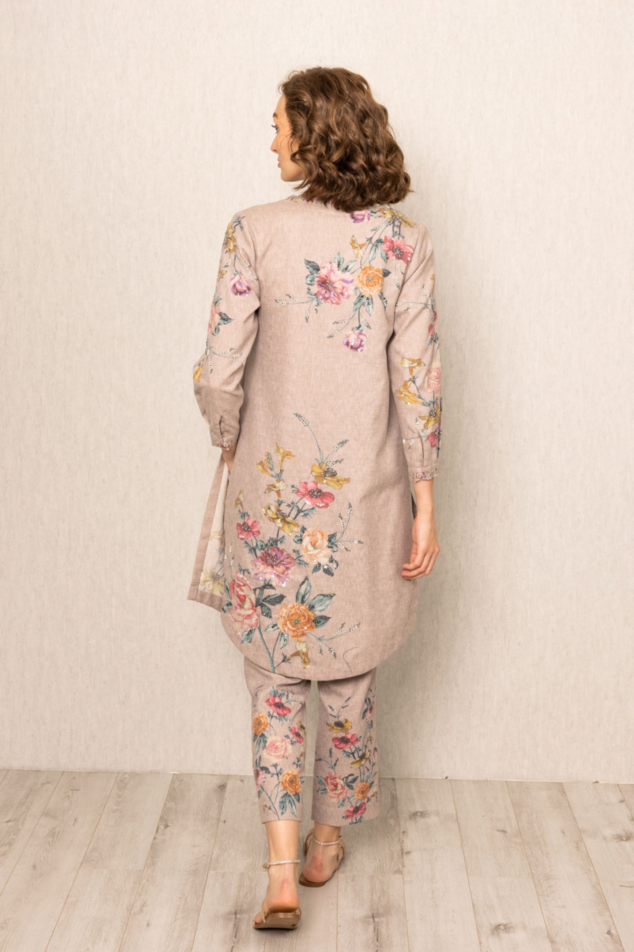 • Introducing ranna gill's mallow tunic set, a relaxed-fit tunic set in a soft dusty beige hue, crafted in breathable poly flex. Designed with full-length sleeves and a gently curved v-neckline, it features multi-colour work which looks perfect on the silhouette, echoing an artwork of blooming fields. Tonal buttons trail down the front, with delicate edging at the neckline and cuffs. Paired with straight-fit trousers that mirror the same work for a seamless look-ideal for sunlit mornings and mellow evenings.