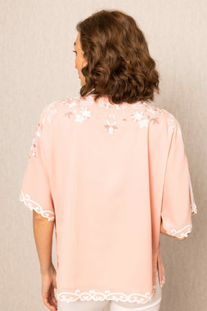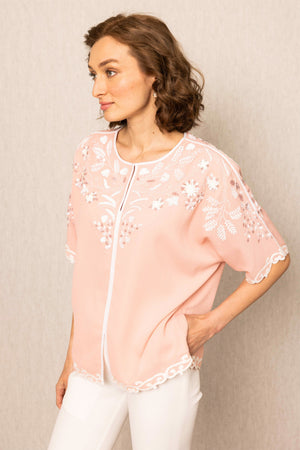 • Step into glam look with ranna gill's naira top, cut from poly crinkle bassam in a millennial pink hue, this top features short sleeves and a round neckline with a subtle front slit. The top is elevated with embroidery and sequin accents, forming delicate botanical-inspired patterns across the yoke and sleeves. Scalloped edges and white appliqué tracing the hem and sleeves add a touch of contrast and texture. Paired with solid ivory trousers, this look transitions seamlessly from day to evening.