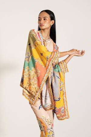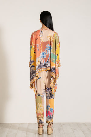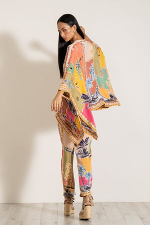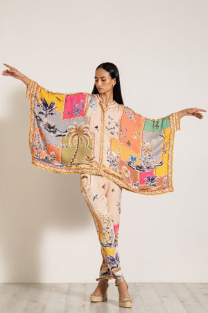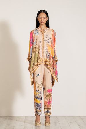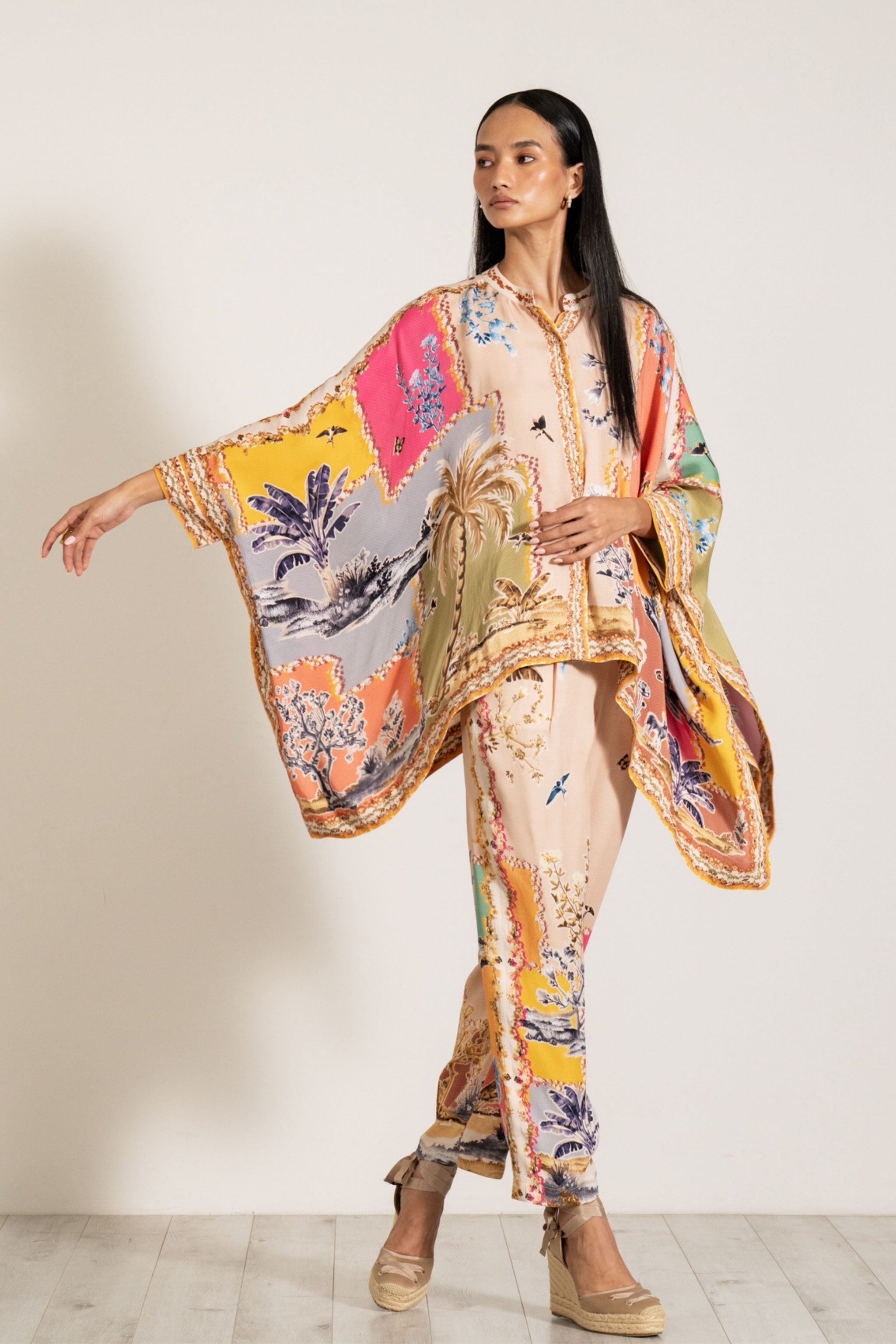 • Introducing ranna gill's olivia co-ord from the marbella dreams collection— a seamless blend of tropical charm and relaxed elegance. The flowy kaftan, with its mandarin collar and wide sleeves, pairs effortlessly with the sleek, straight-leg pants tailored in luxe modal satin. Featuring the palm beach print with lush palms, exotic florals, and serene landscapes, this co-ord set brings tropical luxury to life, perfect for breezy getaways and style statements.