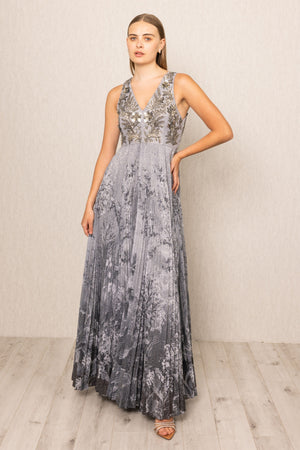 • Featuring ranna gill's riva pleated gown, designed in printed viscose sequins georgette, this pleated gown shows a sleeveless cut with a deep v-neckline. The bodice is highlighted with shimmering sequin embroidery in a botanical pattern, adding a striking contrast. The grey ombre fabric features a delicate landscape-inspired print, transitioning seamlessly into finely pressed pleats that enhance movement. The full-length silhouette creates a flowing drape, making it a standout piece for evening events.