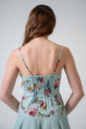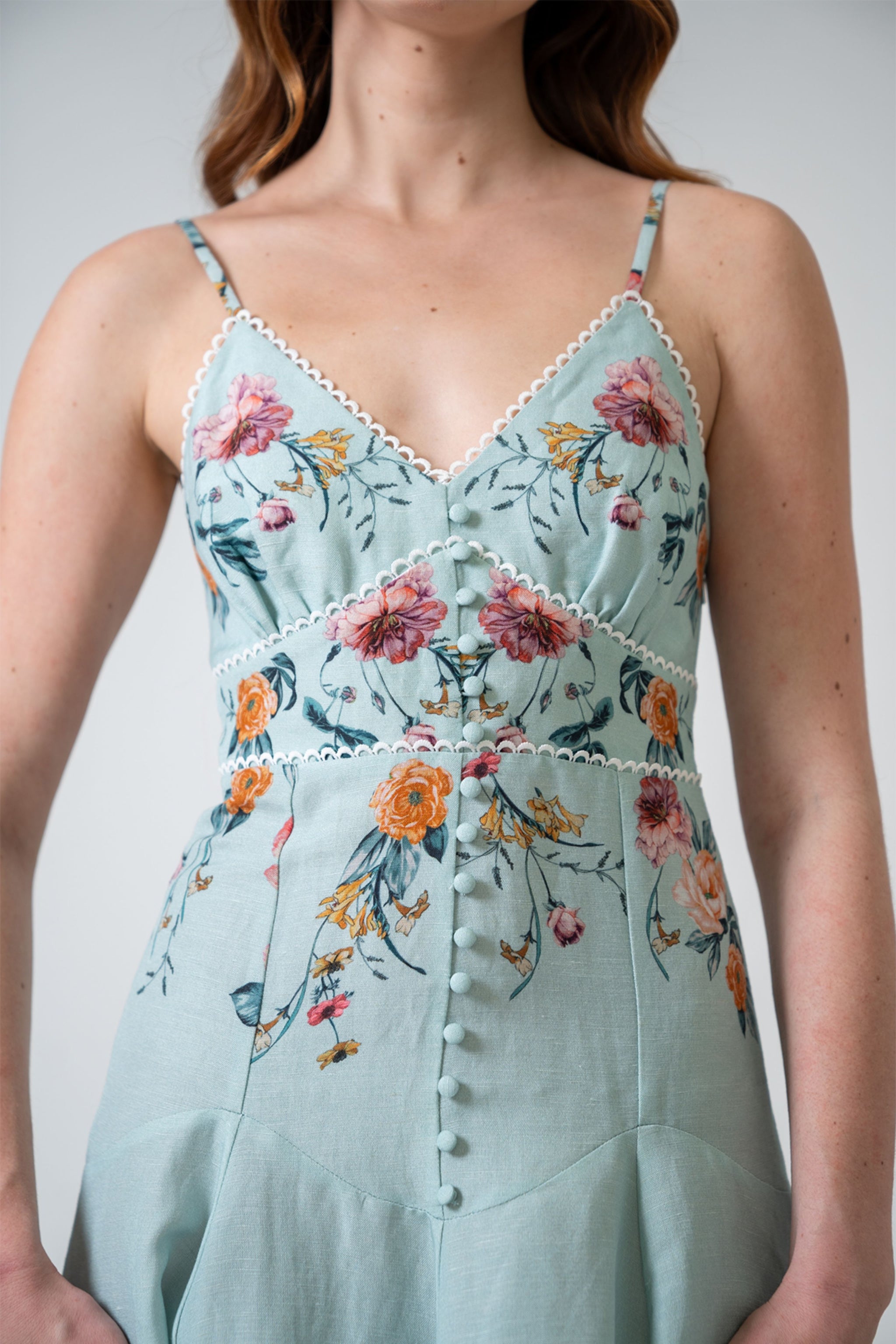 • Ranna gill's roselle strap midi dress in jade rose print features a soft blend of pastel colors with a floral design inspired by blooming gardens. The dress offers a feminine and light look, with a flattering silhouette that complements its nature-inspired print. Perfect for spring and summer occasions, this midi dress works well for relaxed day events, garden parties, and casual gatherings. Its versatile style can easily transition from daytime outings to evening dinners, making it a go-to piece for enjoying easy, joyful moments.