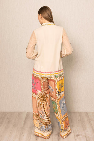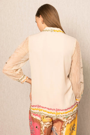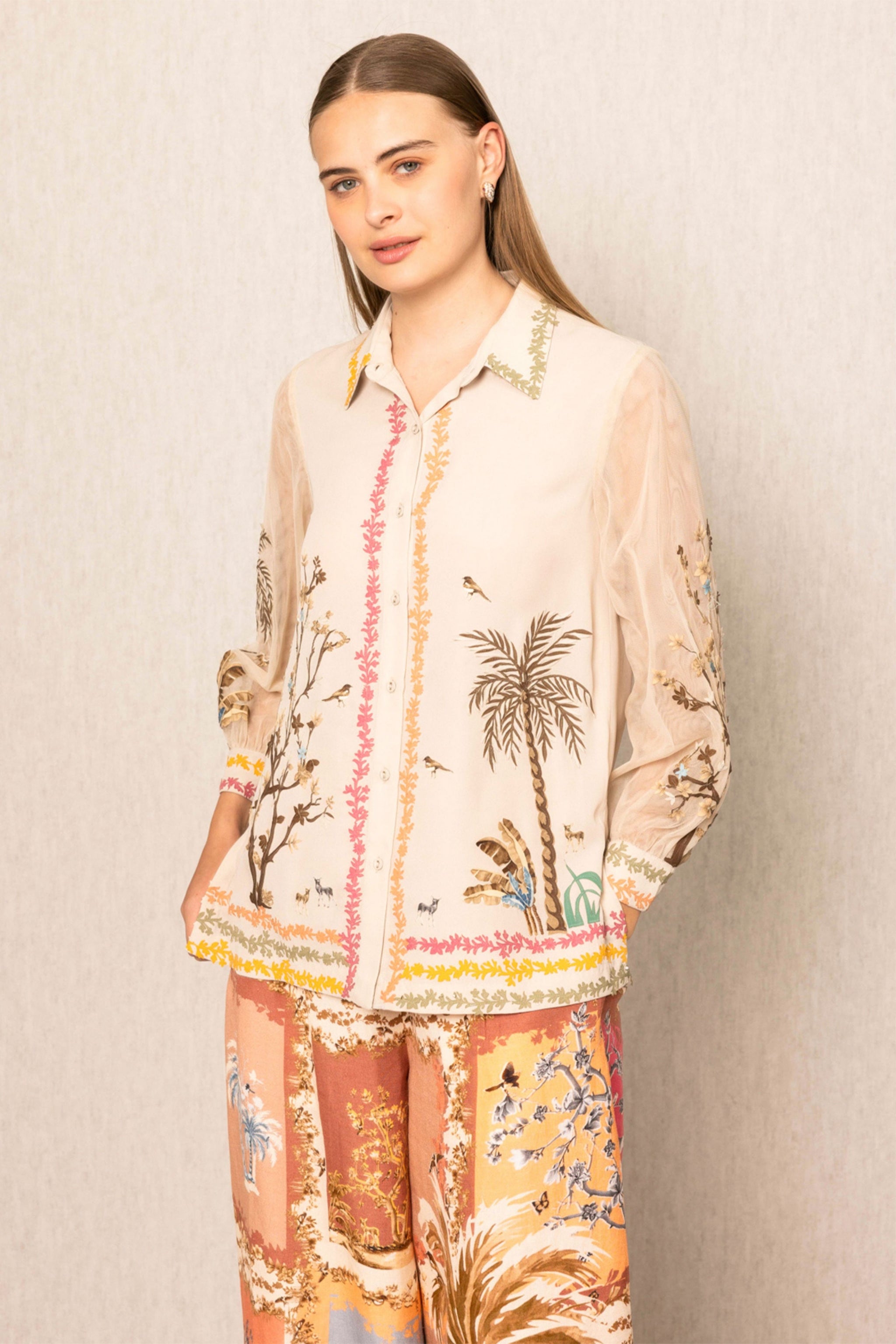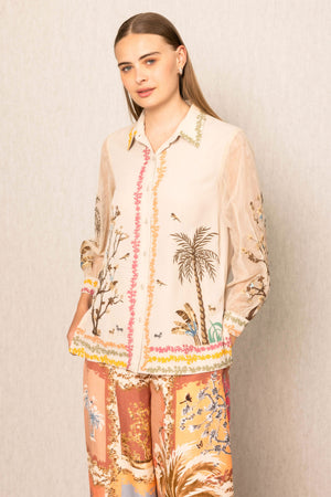 • Ranna gill's sara flora shirt made in royal georgette features a button-down front with a sharp collar. The beige fabric is adorned with detailed artwork of palm trees, birds, and foliage, creating a scenic composition. The sheer full-length sleeves highlight embroidered tree motifs, adding depth to the design. Contrast border embroidery along the front placket, cuffs, and hemline enhances the look. Pair it up with the ivy wide leg pant or your basic trousers for the perfect look.