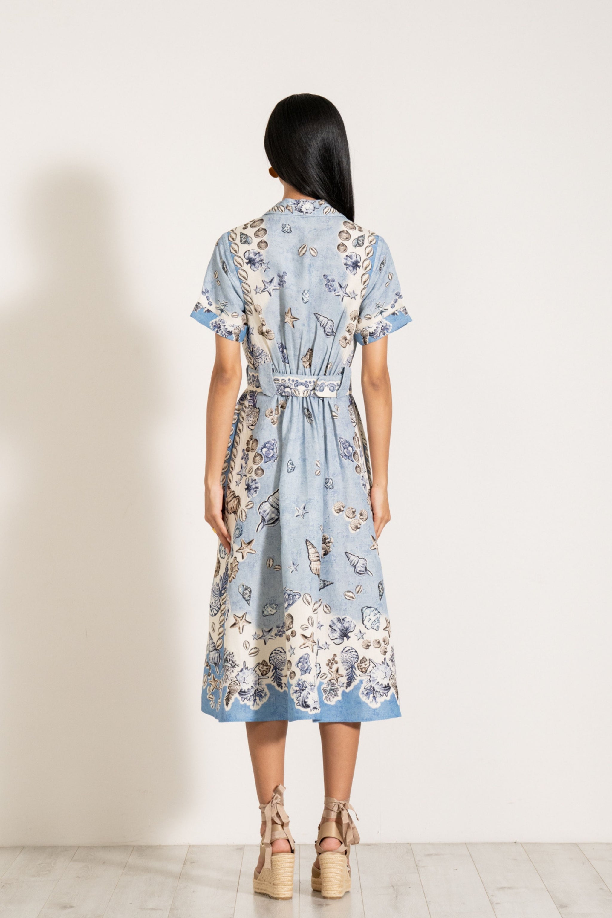 • The vega midi shirt dress by ranna gill is a timeless elegance. It features a structured waist adorned with a belt that accentuates your curves beautifully. The flowing pleated skirt adds movement and grace, creating a flattering silhouette. The dress is adorned with the serene atlantic print, showcasing intricate marine-inspired motifs like seashells and starfish in soothing blue and white tones. The notched lapel collar neckline adds a sophisticated touch, making it perfect for versatile styling. Effortless and chic, this ranna gill creation is a true wardrobe essential.