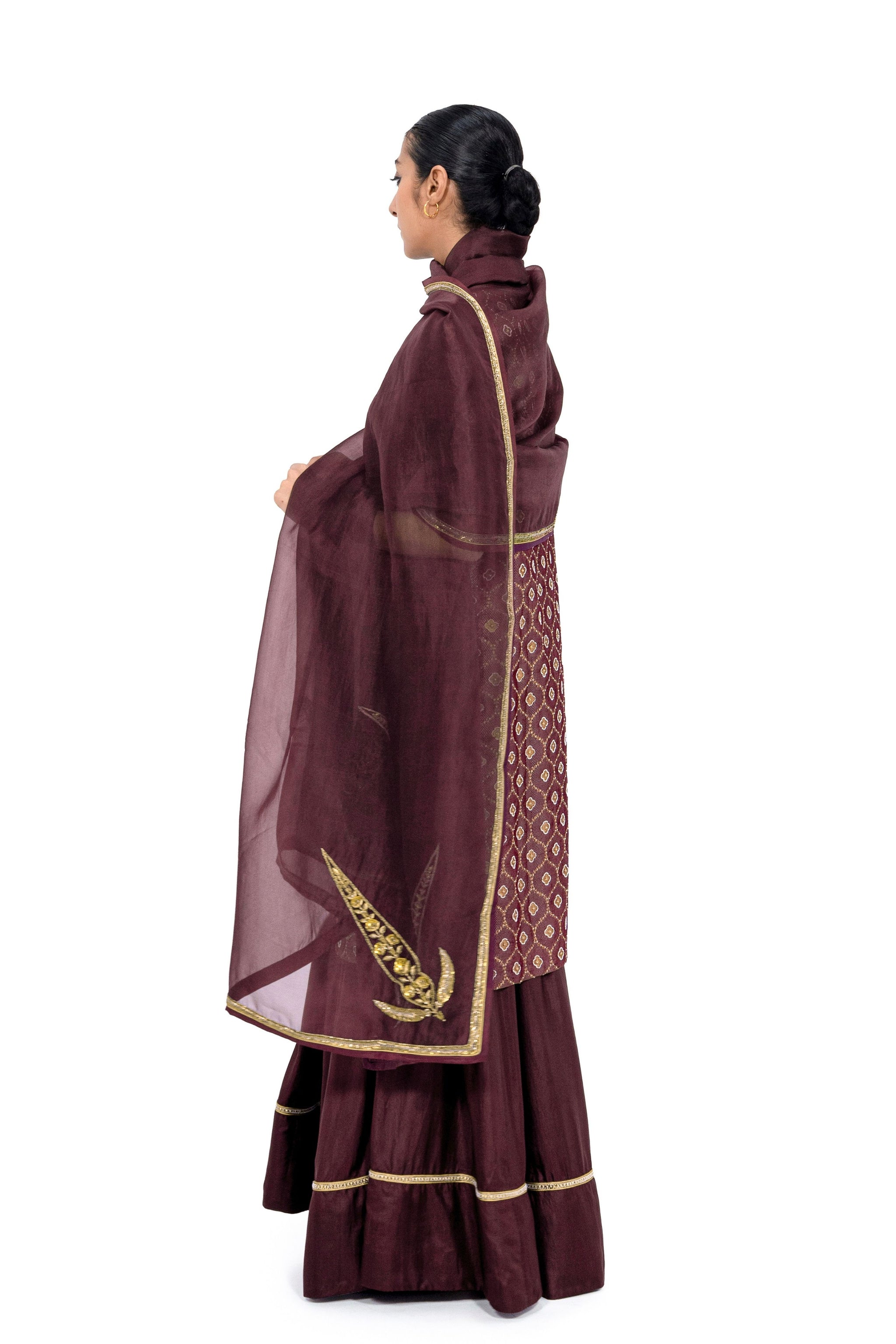 • 'Ajnod' maroon kurta features an archival floral jaal, woven with gold zari and silver meena. The varanasi silk brocade textile features zardozi embroidery with moti (pearl), which adds to the tactility of the weave, uniting weaving (bunai) and embroidery (kadhai). It is paired with the maroon 'umari' lehenga. This handwoven textile reflects natural variations within yarn, color, weave or embroidery.