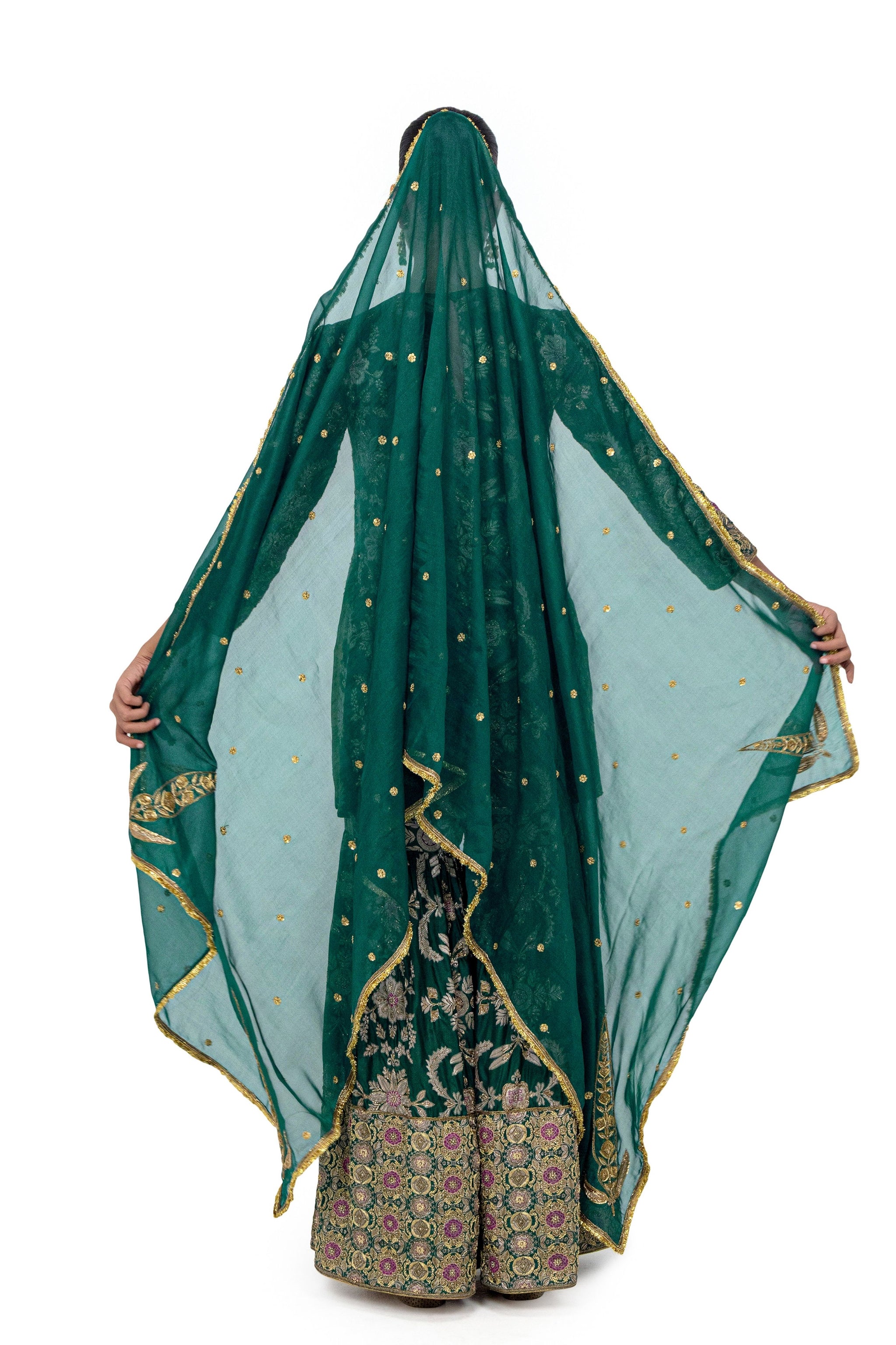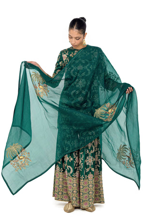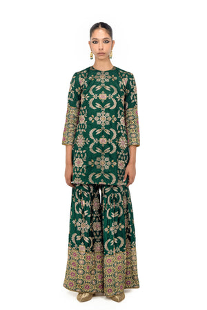 • ‘Amdara' green kurta draws from kalamkari chintz textile archives, featuring a trellis of flowers in an organic 'jangla' pattern. It is realised in varanasi silk brocade engineered for zardozi embroidery which adds to the tactility of the weave, uniting weaving (bunai) and embroidery (kadhai). It is paired with the green 'acheli' sharara. This handwoven textile reflects natural variations within yarn, color, weave or embroidery.