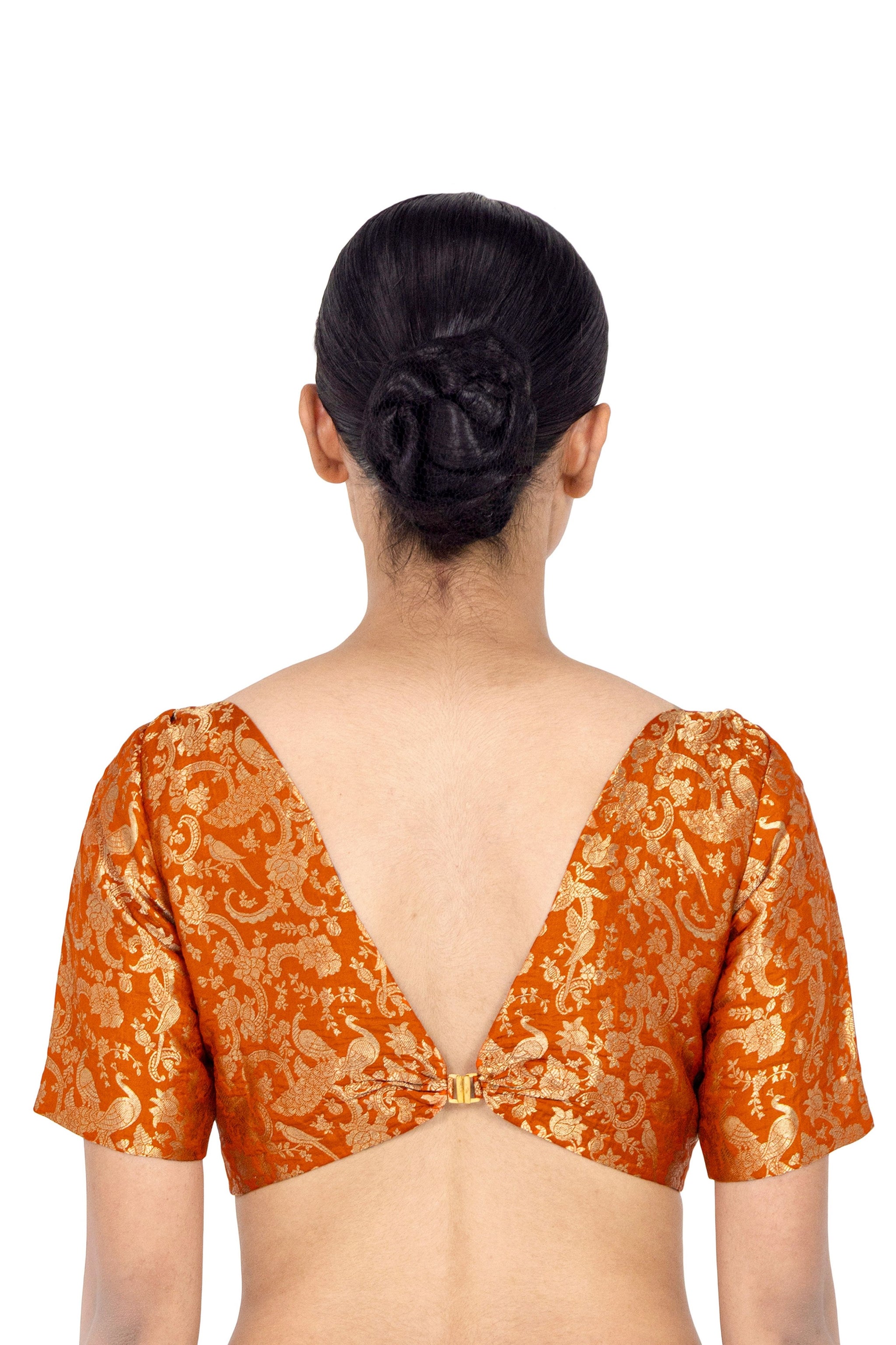 • 'Pirer' gerua orange blouse in varanasi silk brocade is gathered at the shoulders and the center of the bust and has half sleeves. Drawing from the printed toile de jouy textiles from france, it features an organic floral 'jangla' pattern with peacocks and parrots, woven with gold zari. This handwoven textile reflects natural variations within yarn, color, weave or embroidery.