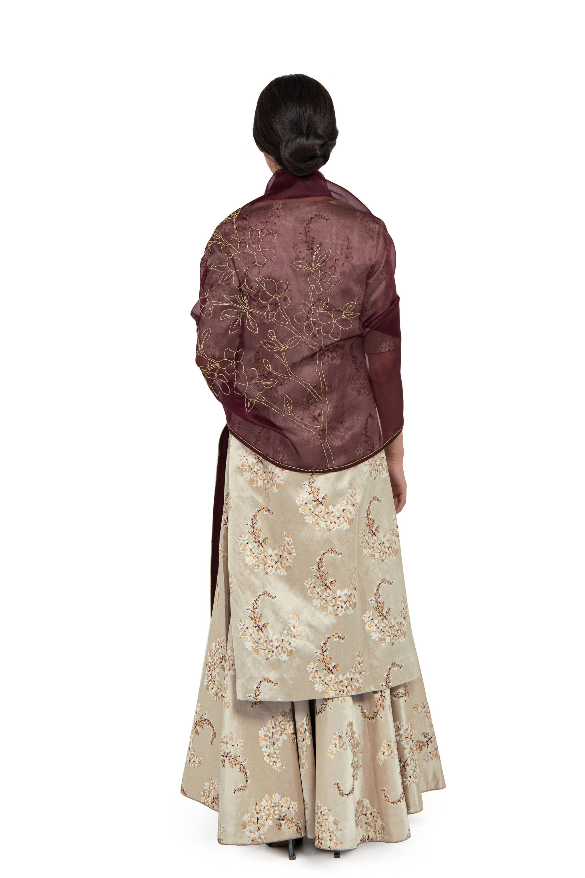 • Rikka maroon silk organza odhani features zardozi embroidered flora. It is highlighted with glass beads and sequins.