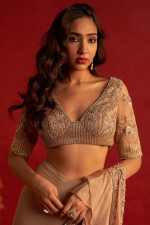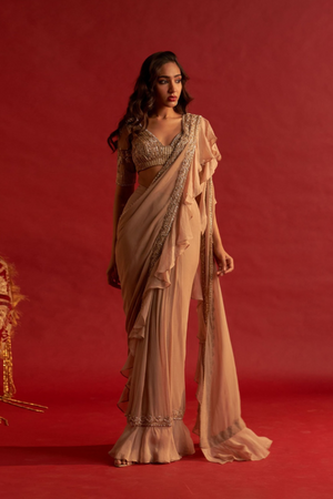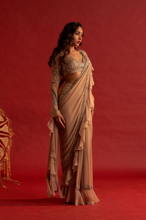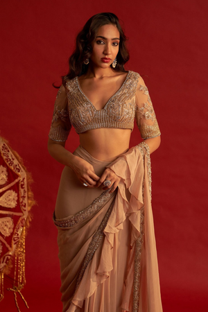 • Plunge neckline heavy embroidered 1/3rd netted sleeve blouse with pre stiched draped ruffle saree with embellished border. Hand embroidered work details - nakshi,zardosi,zari,cutdana,swarovski,nalki work