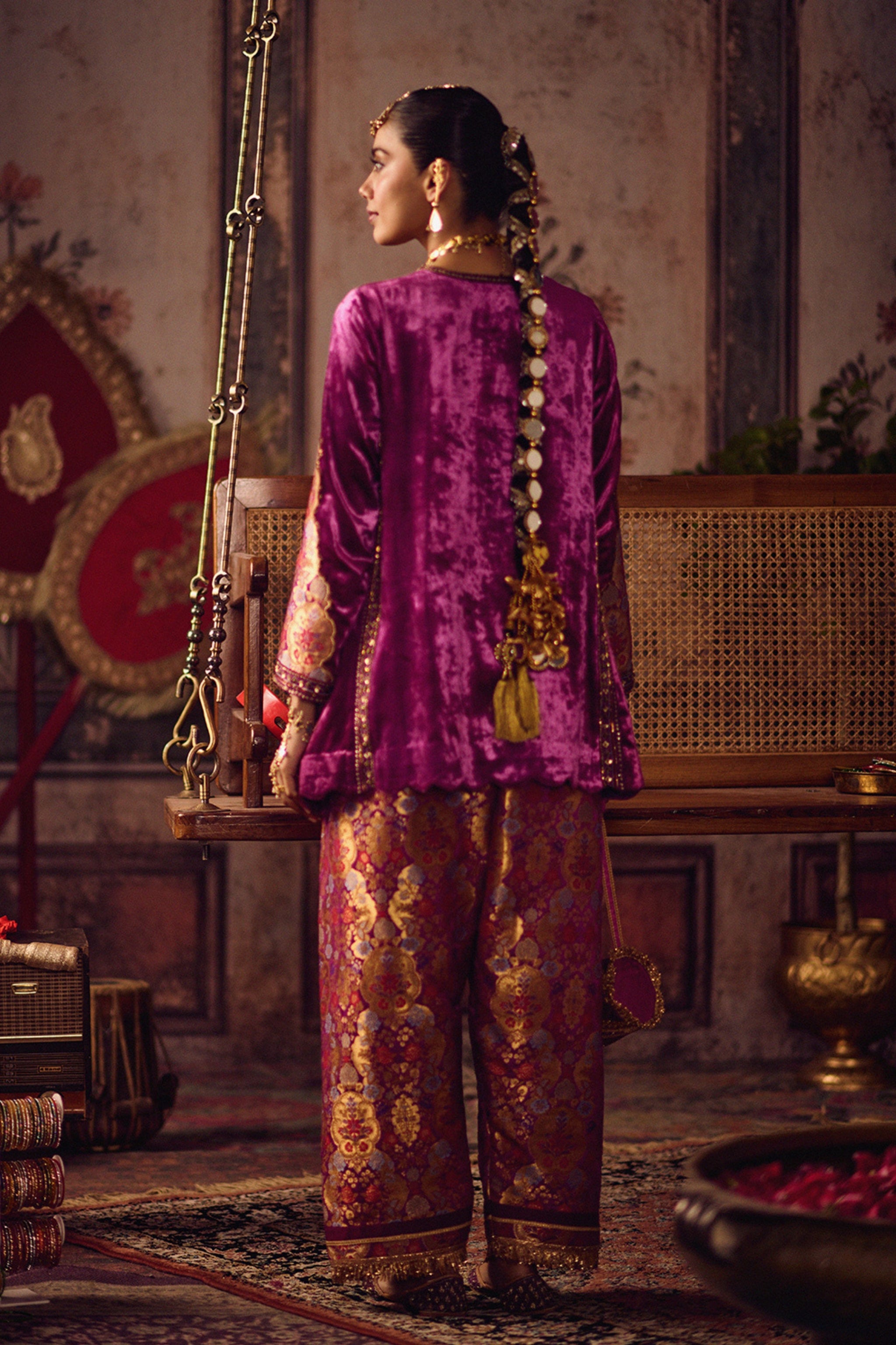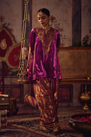 • This anti-fit silk velvet kurta in rich magenta pink features detailed neck craftsmanship and panelled sleeves with hand embroidery. Paired with a kheem khaab salwar in a relaxed silhouette, it reflects bold Punjabi couture with regal ease.