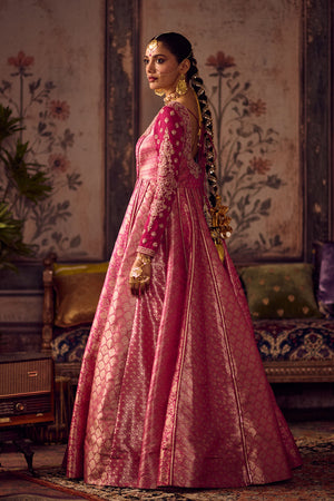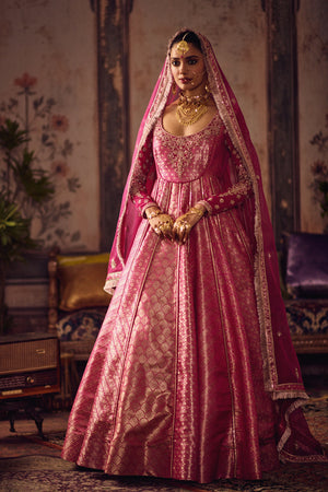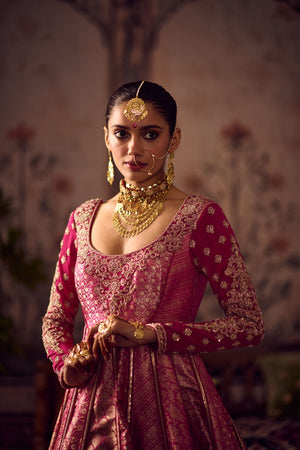 • Rani pink silk Banarasi anarkali kurta with hand embroidery motifs on neckline and double georgette sleeves, flared kali panels for graceful drape.