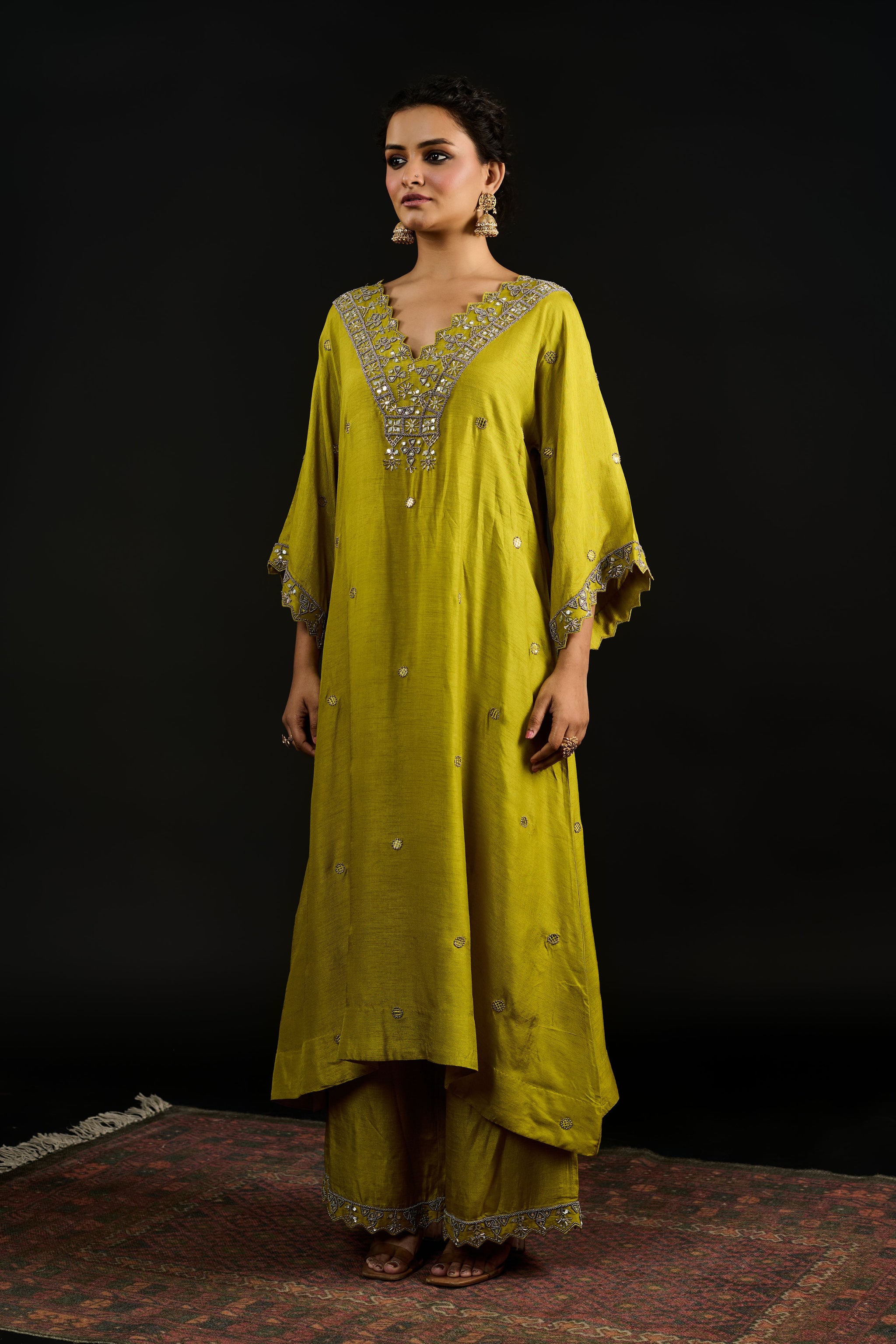 • Lime green v-neck kurta with hand embroidery, thread work, nalki, sequins, and beads, paired with palazzo pants.