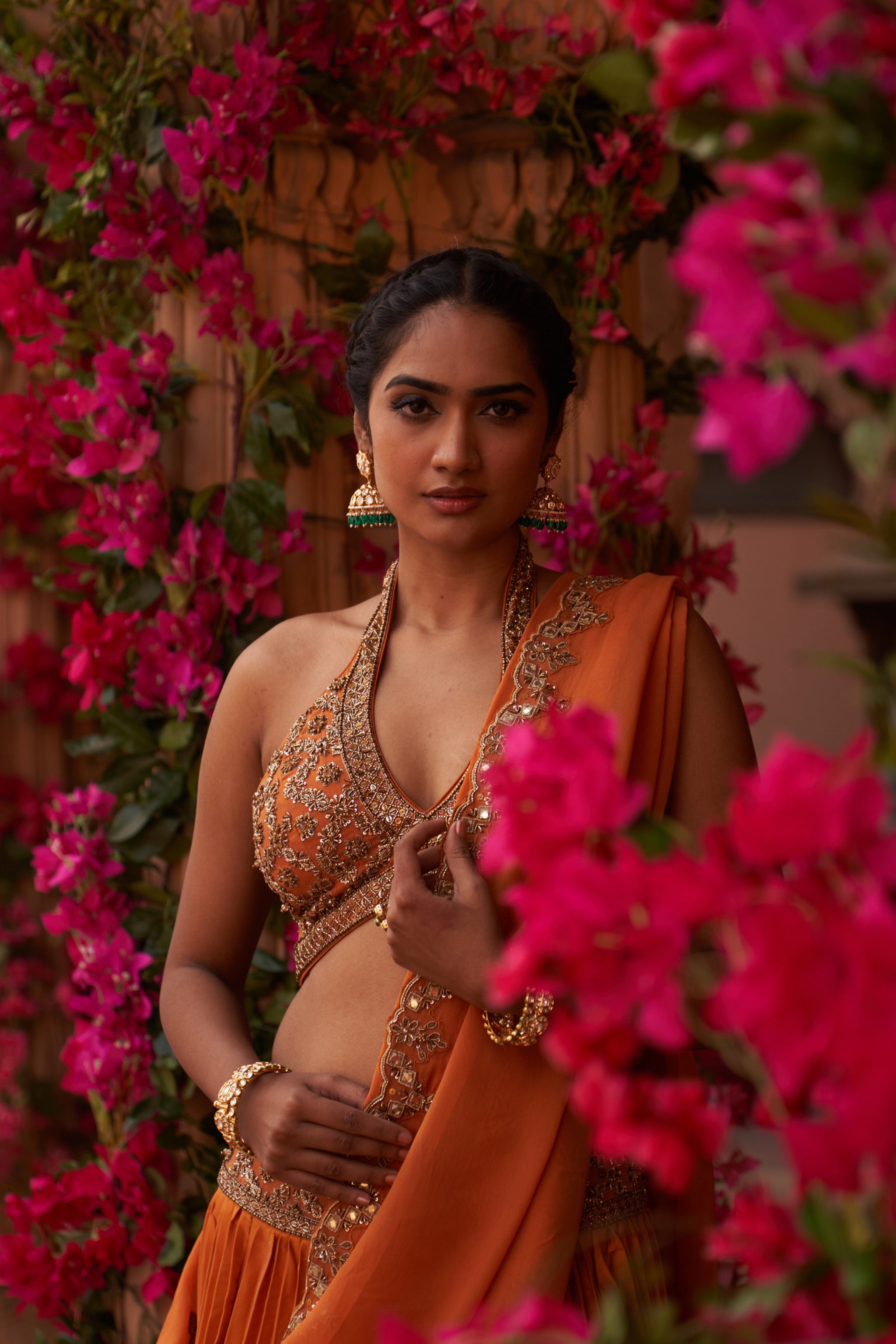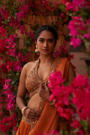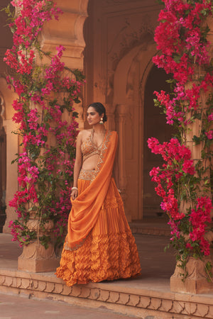 • Halter blouse and scallop dupatta with pleated lehenga embroidery - glass beads, nalki, salli , cutdana