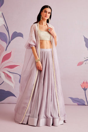 • Embroidered net blouse with chiifon skirt and embroidred cape