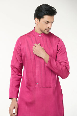 • Fuscia pink modal silk based kurta, enhanced with pintuck detailing, paired with an off white cotton silk based Mexican pants.
