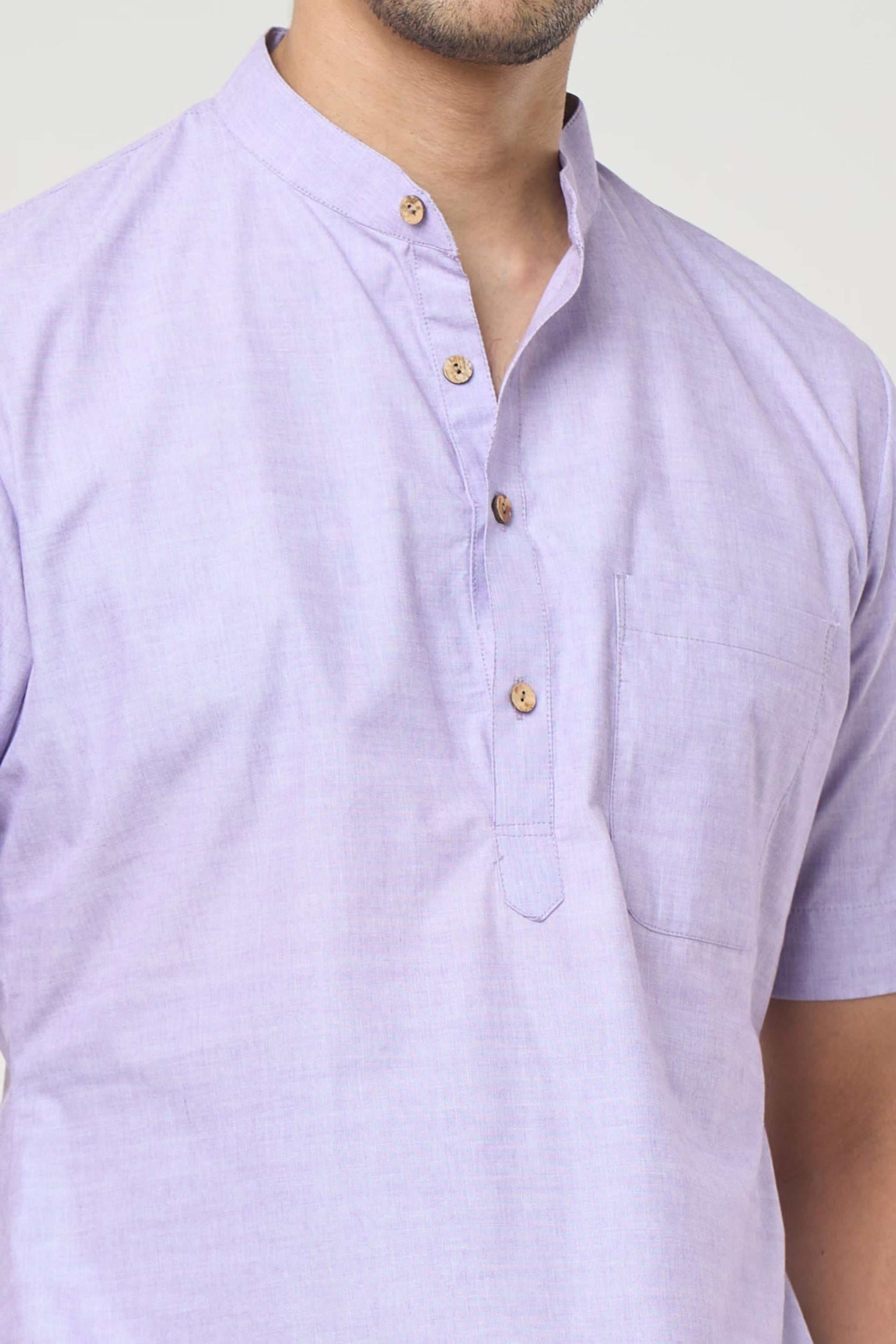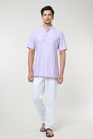 • Lilac cotton based, half sleeves, shirt style, solid kurta, enhanced with wooden buttons paired with an off white cotton based Mexican pants