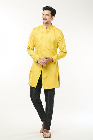 • Lime yellow modal silk based kurta, enhanced with pintuck detailing, paired with an off white cotton silk based Mexican pants.