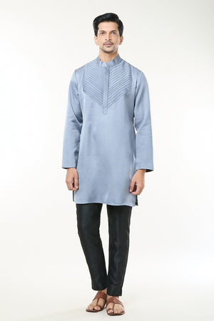 • Steel grey modal silk based kurta, enhanced with pintuck detailing, paired with an off white cotton silk based Mexican pants.