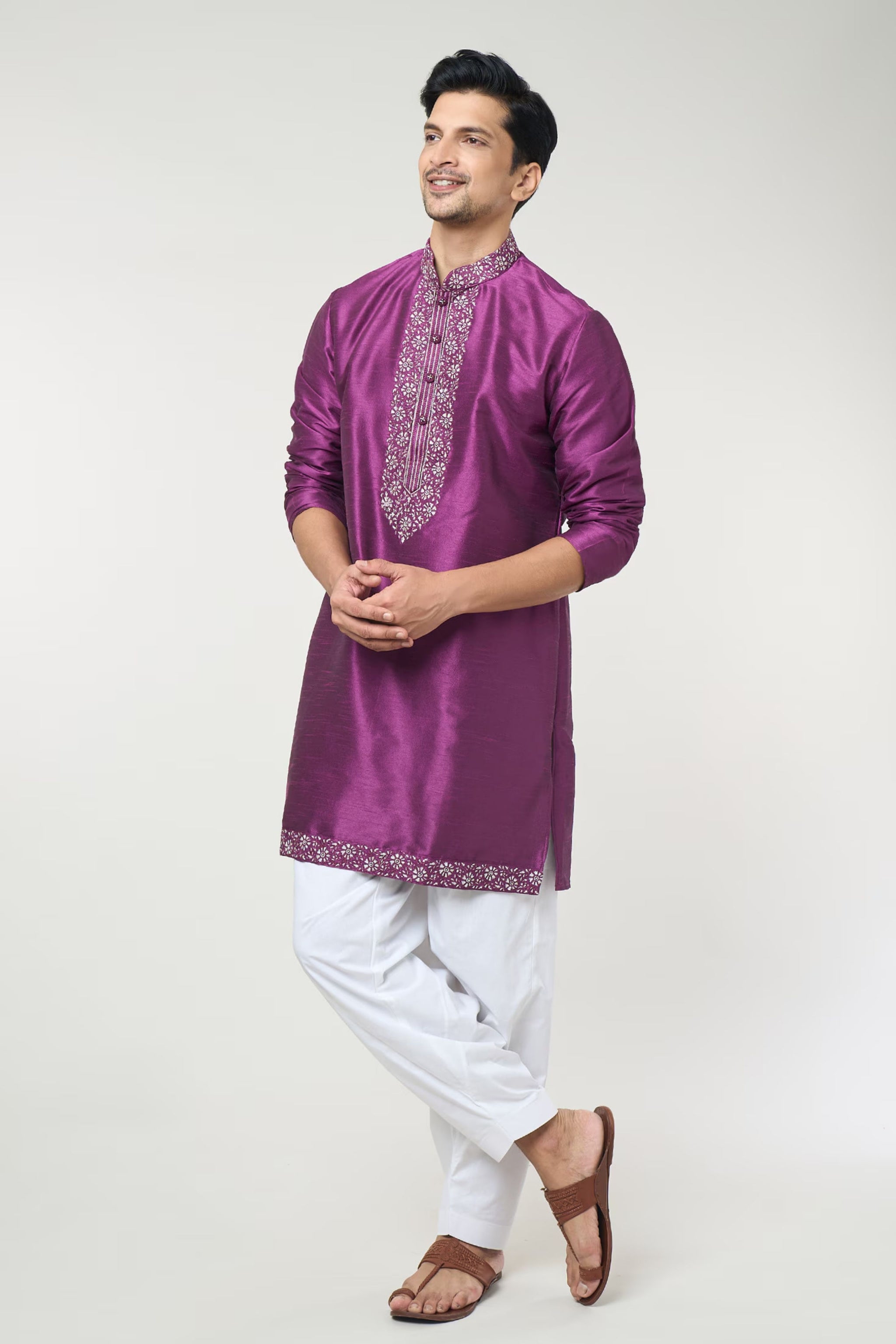 • Violet cotton silk based kurta, enhanced with floral thread and sequin embroidery, paired with an off white cotton based pathani pants.