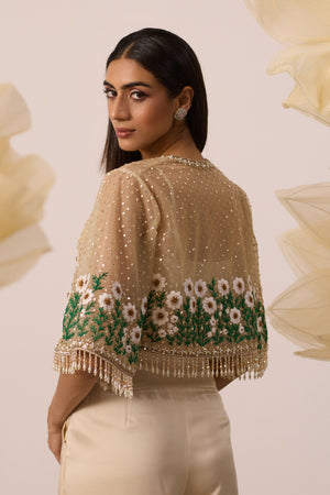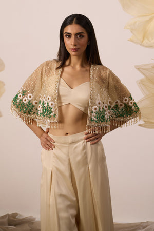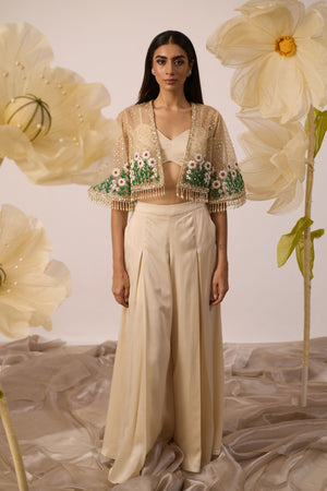 • Gazania ivory cepe and pants set is a perfect amalgamation of serenity and contemporary fashion. The outfit is based on modal satin .Jacket is skillfully designed with exquisite embroidery of resham thread giving it a 3D look and making it a perfect excusite ensemble.