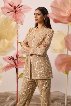 • Turn all eyes on you in this Primose hand embroidered pant suit. The bodice is a floral montone fantasy adorned with floral motif sequins. The combination of fully jacket and pants is an exclusive design and delight to wear.