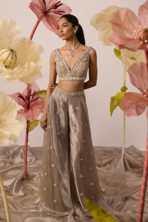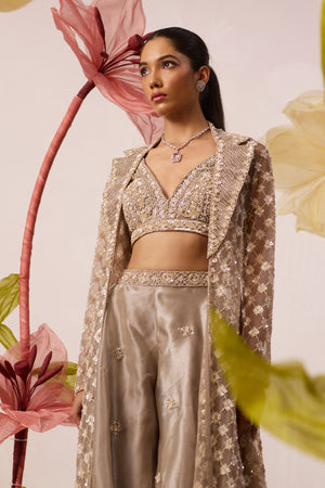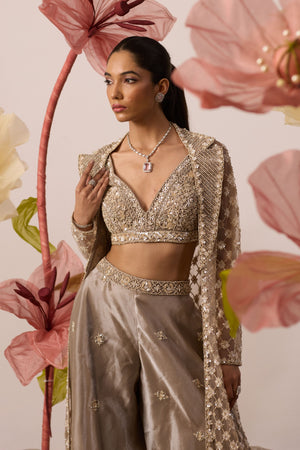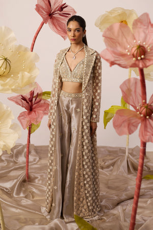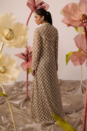 • Embrace a modern interpretation of modern sharara set with long jacket with our exquisite summer of '24 collection. Meticulously designed, it features intricate embroidery , and captivating artwork.