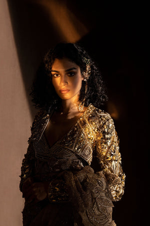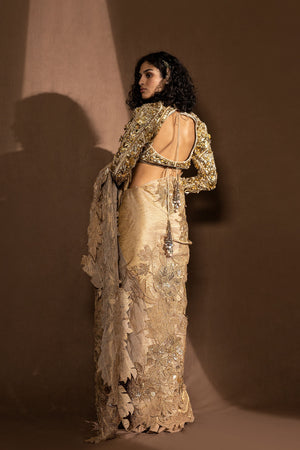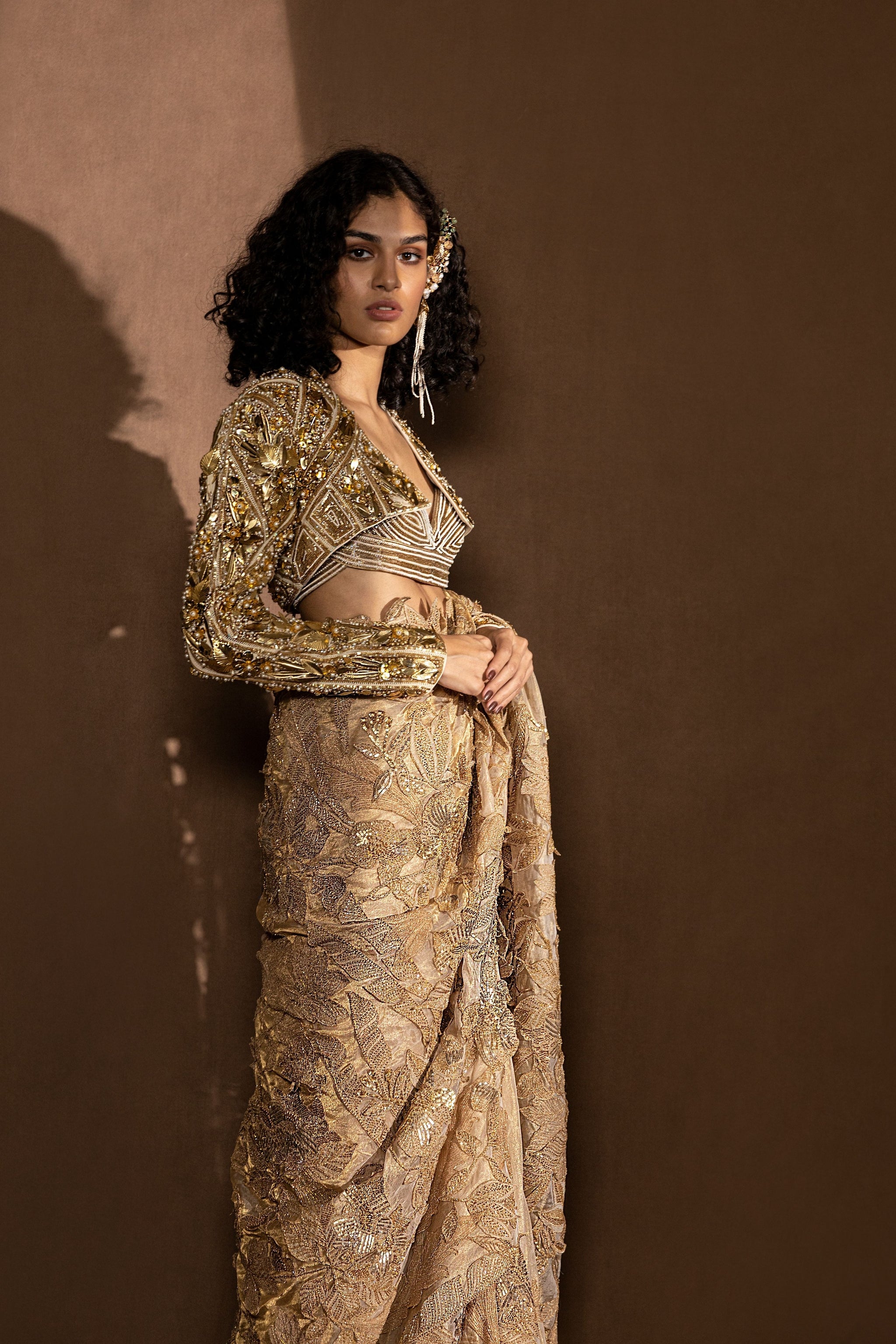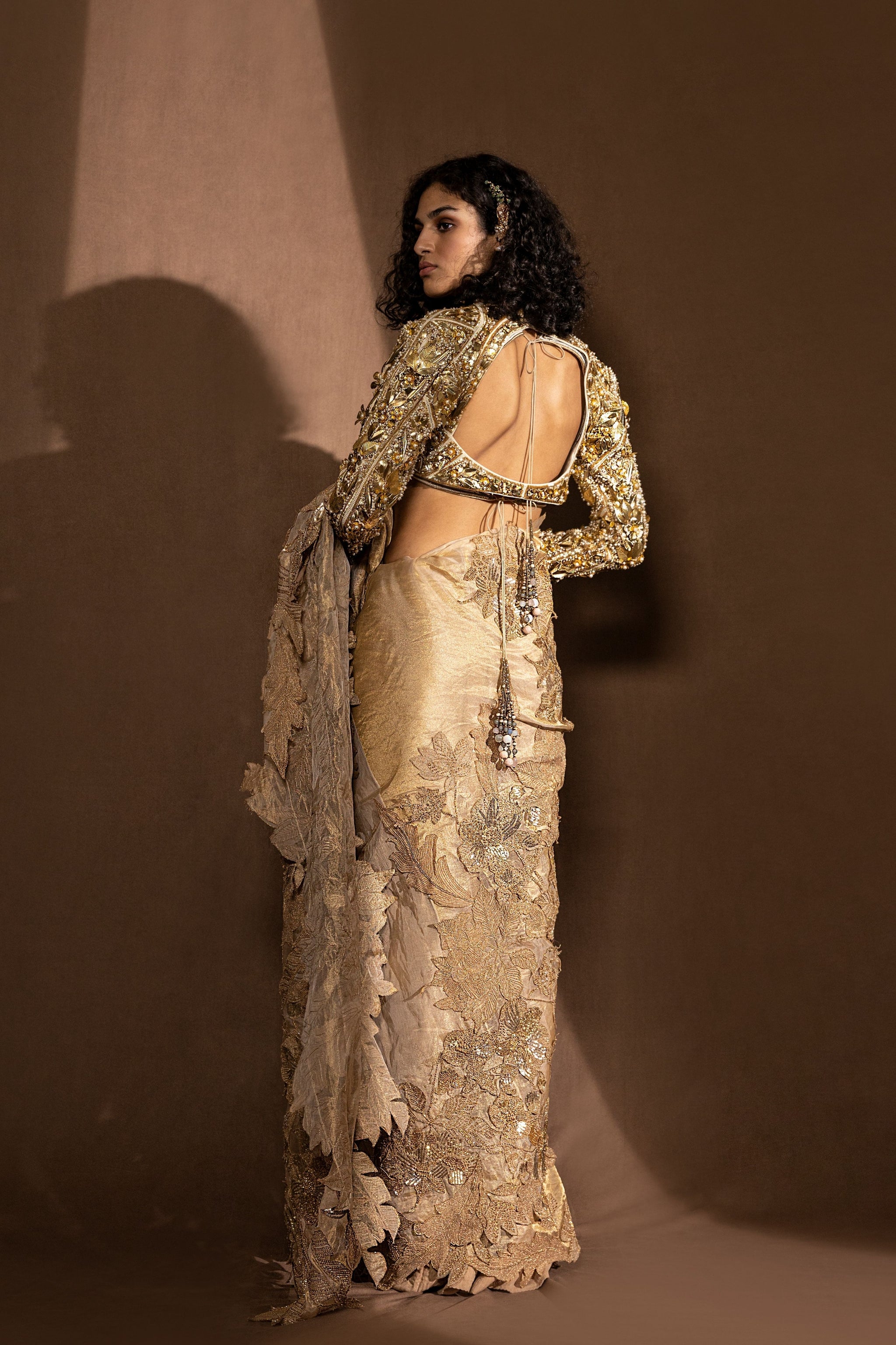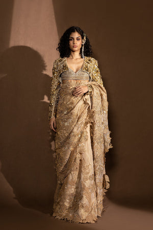 • An embellished shimmering blouse, paired with an adorned saree having intricate flowing gold metal thread embroidery with gold dimmed vibrant hues teamed up with a full-sleeved short shrug decorated with intricate molten metal leaves embroidered over a dense bed of pearls making it one of a kind.
