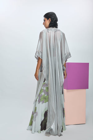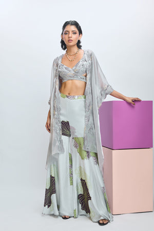 • Glass grey embroidered blouse with printed pants and embroidered scallop dupatta