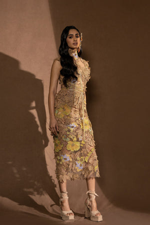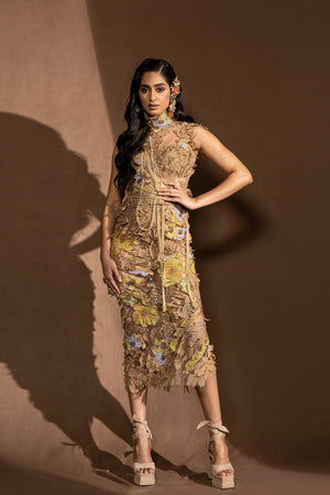 • High neck half-sleeved garment has delicate metallic embroidery inspired by the filigree craft of jewellery making. There is an interesting play of bright hues muted down by gold meticulously placed in an ombre starting as gold and following through to a mix of colours layering on top of each other.