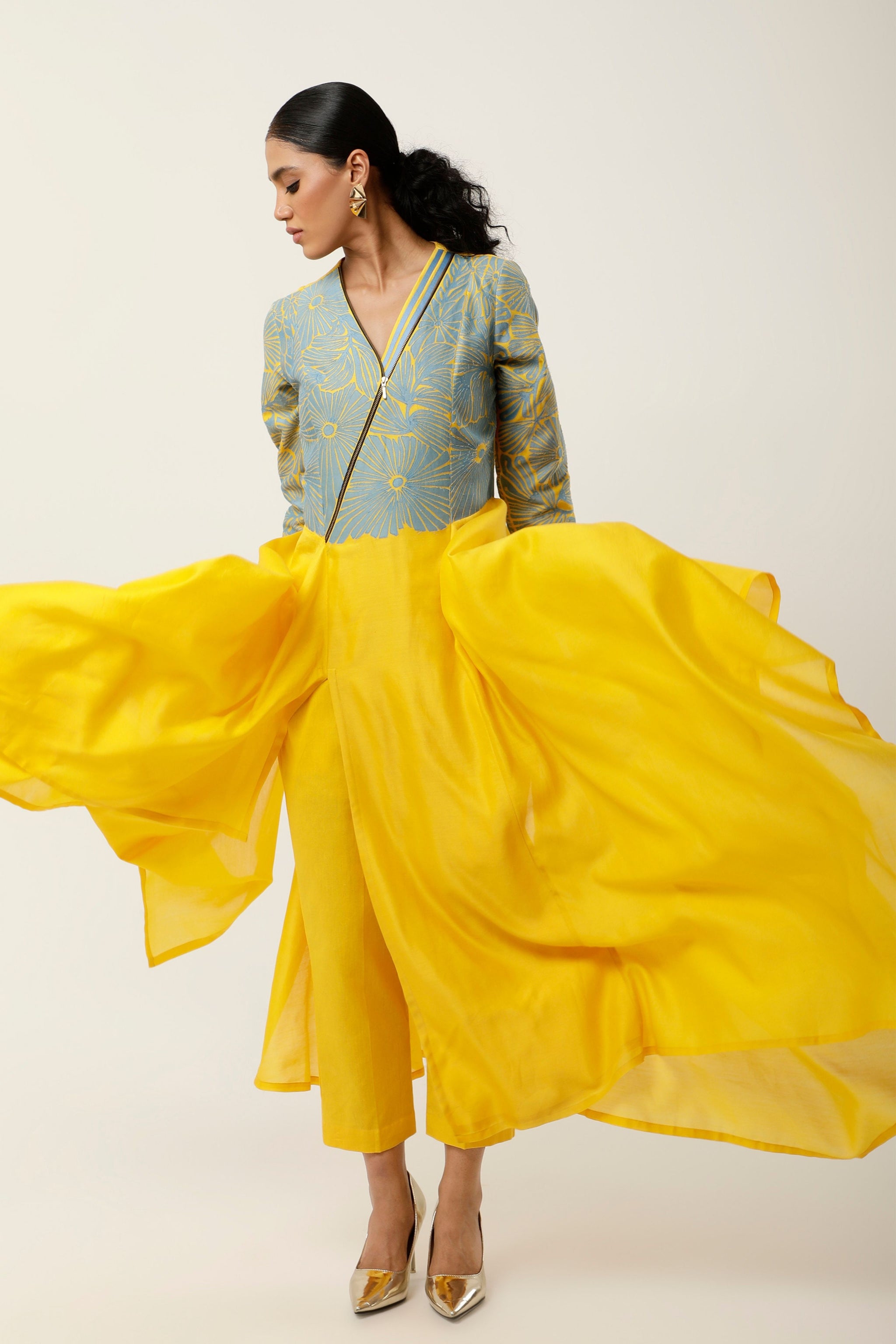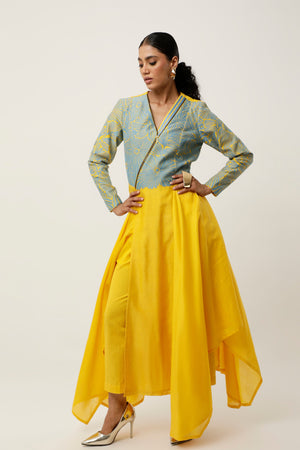 • Zippered v neck cutwork asymmetrical kurta with linen pants