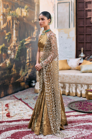 • This fishtail lehenga is in bronze tissue with gold Gota detailing. It’s paired with a matching halter neck blouse with mirror jhalar detailing in the back. A mirror jaal attached palla completes the look.