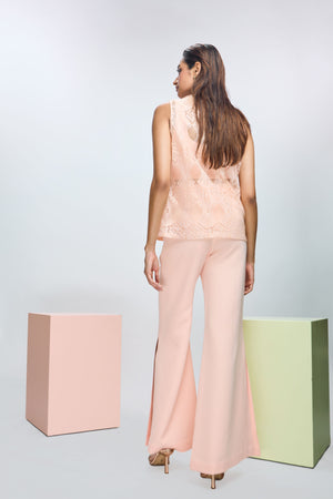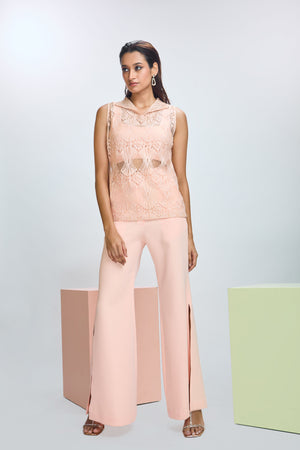 • Peach fuzz chantilly lace sleevless top with and micro crop top and flared pants with side slit