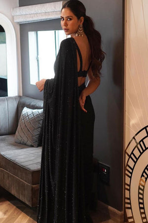 • Black pre stitched saree embellished with crystals, paired with a sleeveless blouse in jersey.