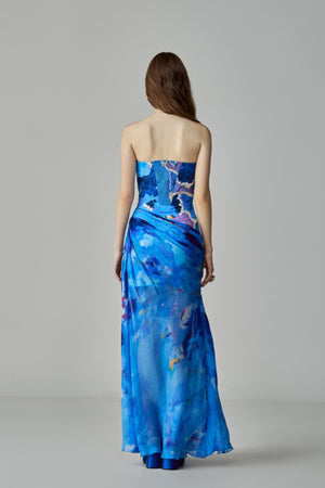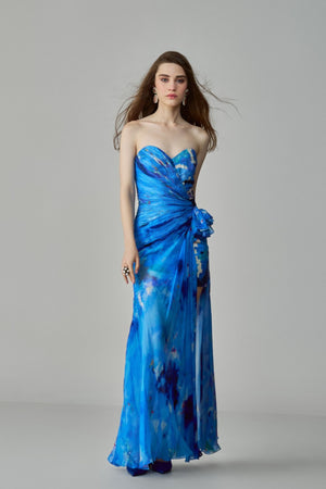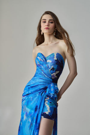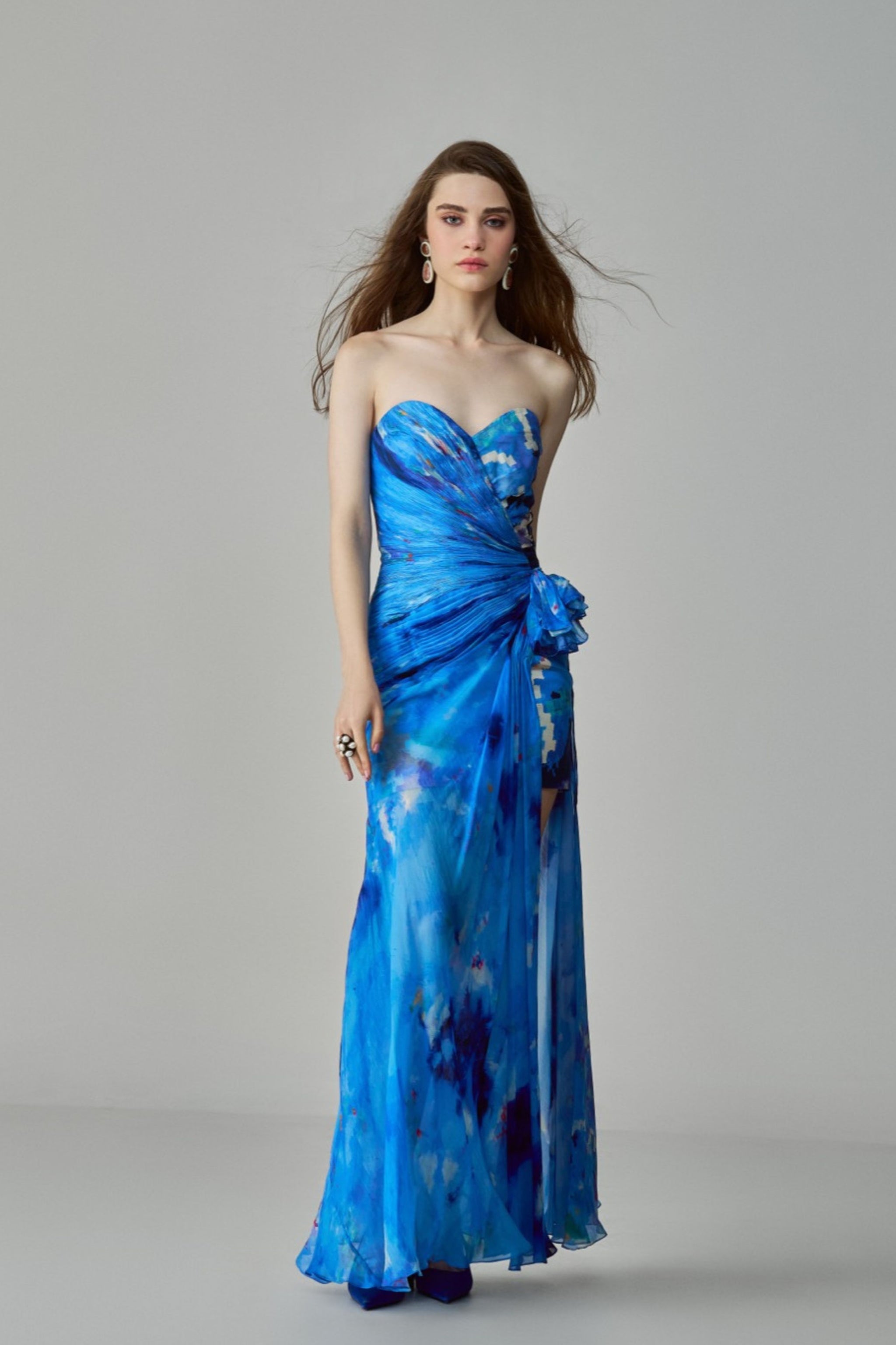 • Ikat inspired print, part hand micro pleat gown with side ruffle detailing and in built skirt