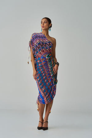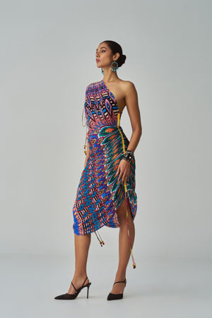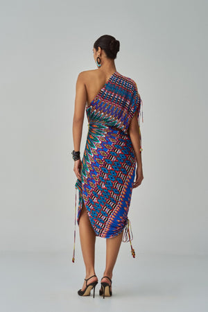 • Ikat print inspired, one shoulder hand micro pleat sari inspired dress with adjustable drawstring sleeve and length