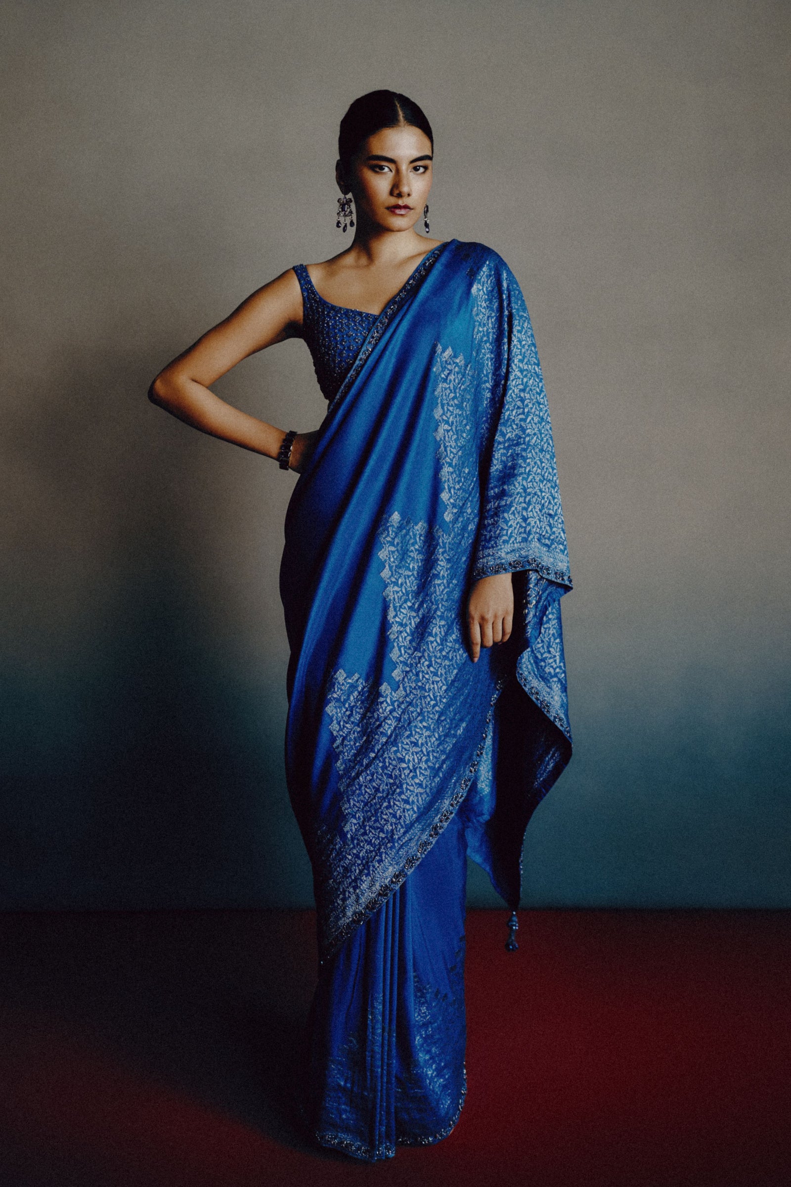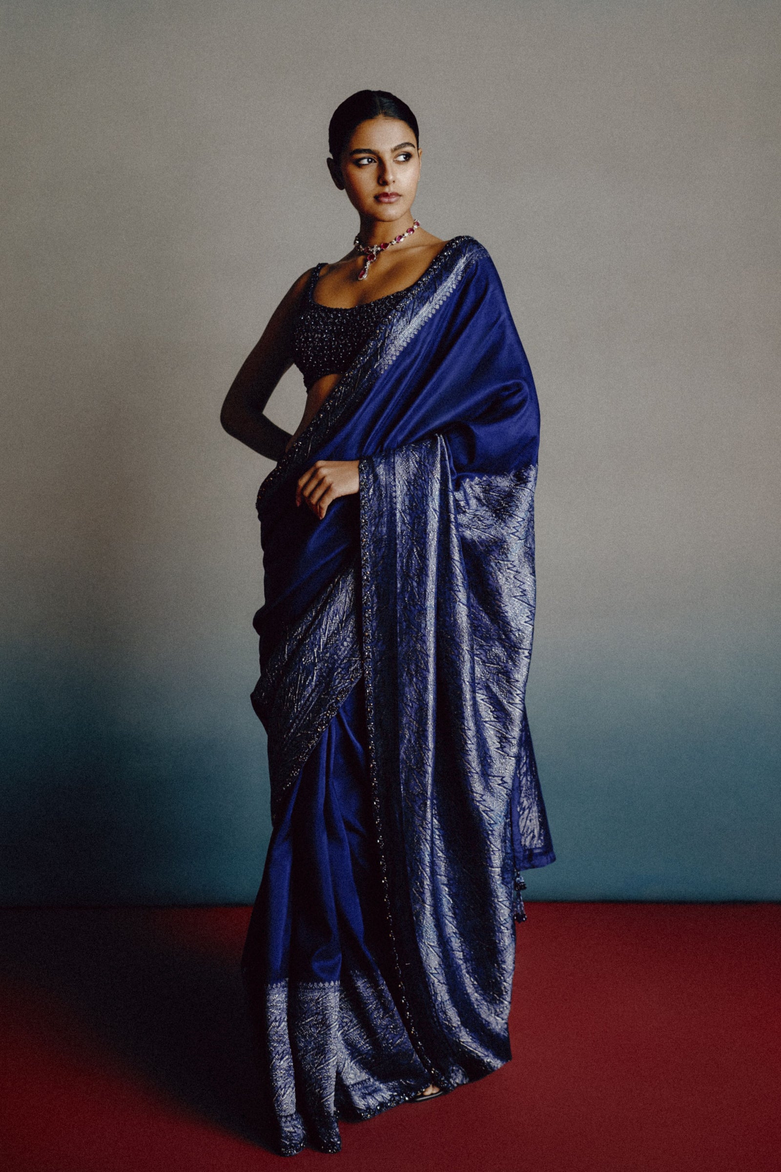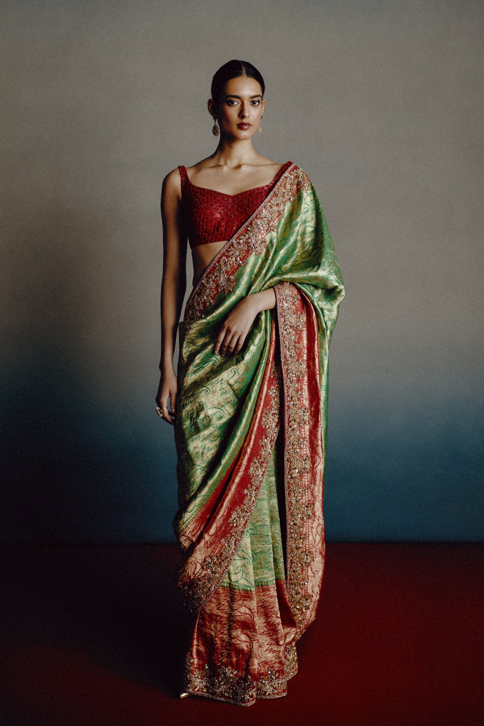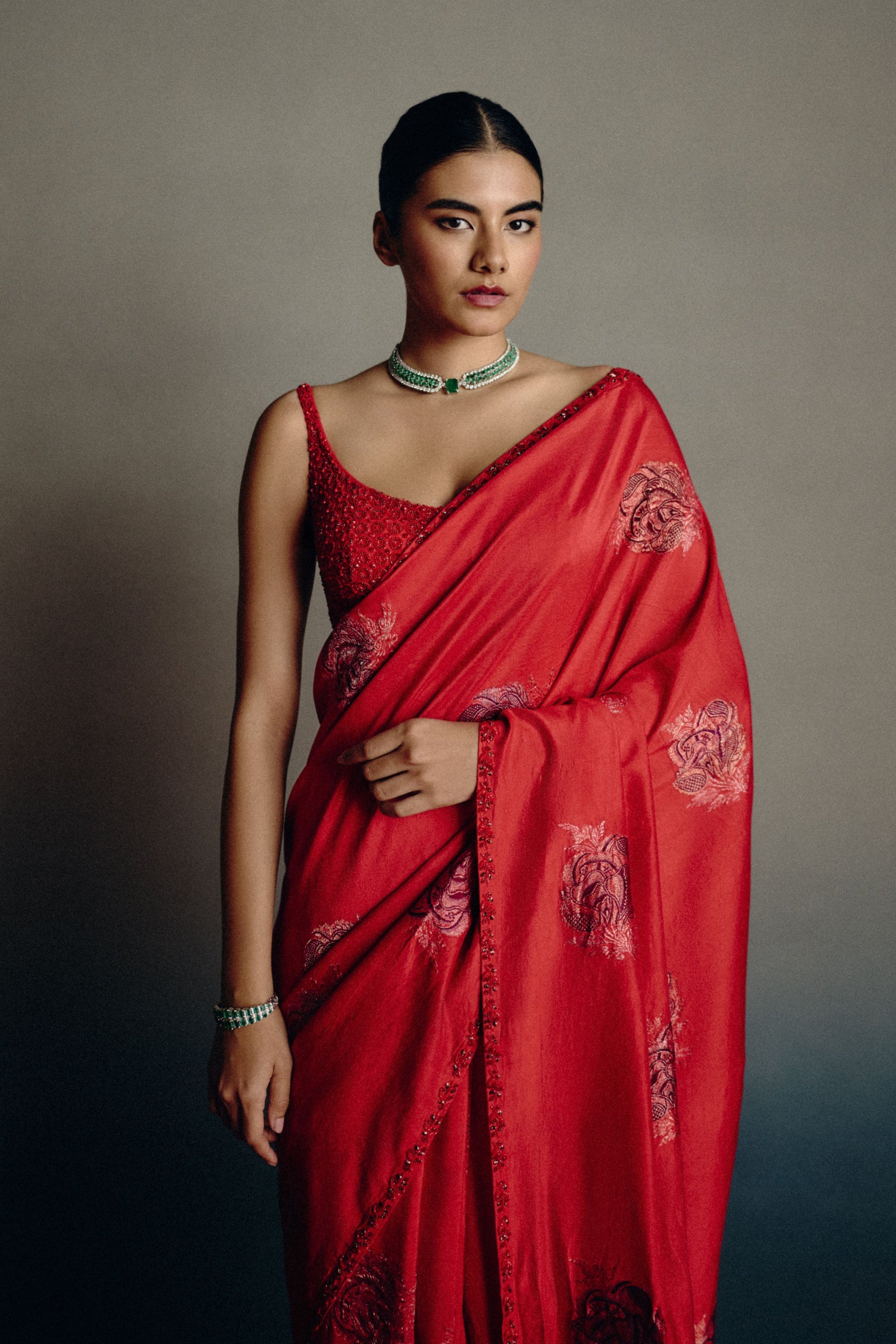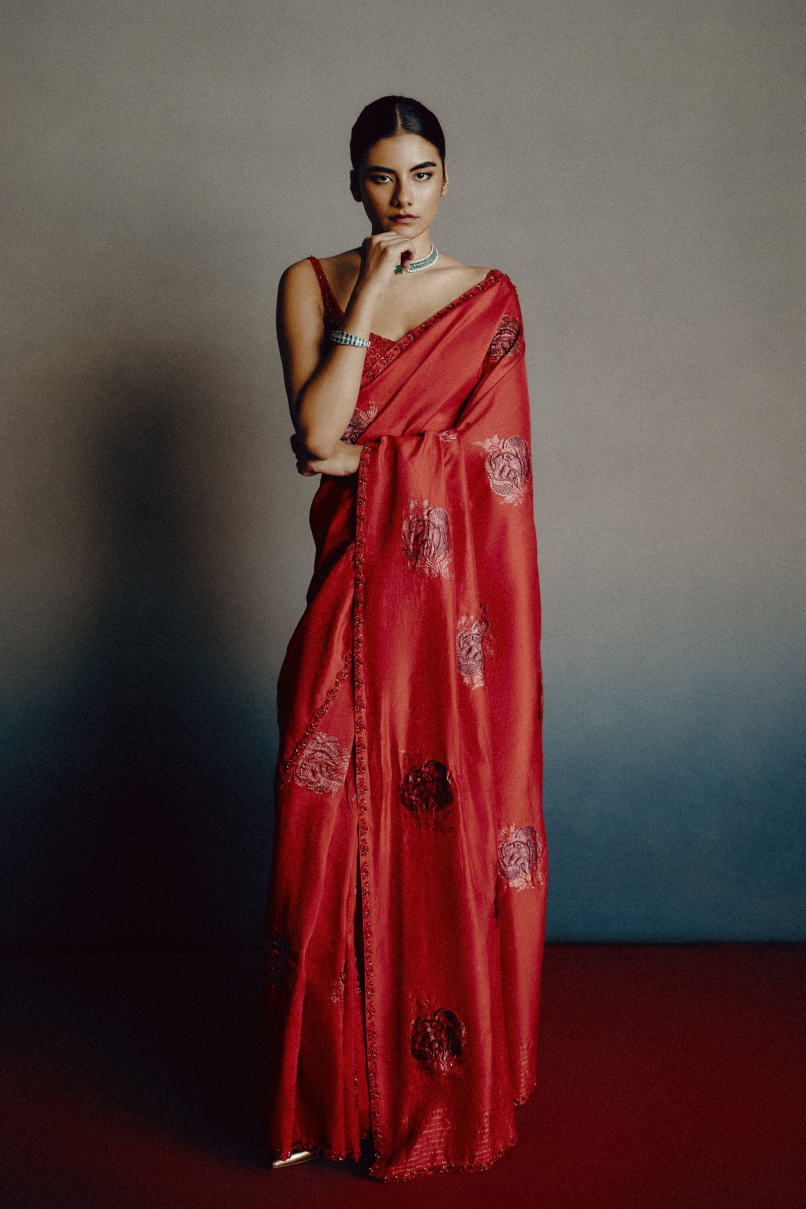 • Radiant red ombre chiffon embellished border saree with a pearl embroidered blouse