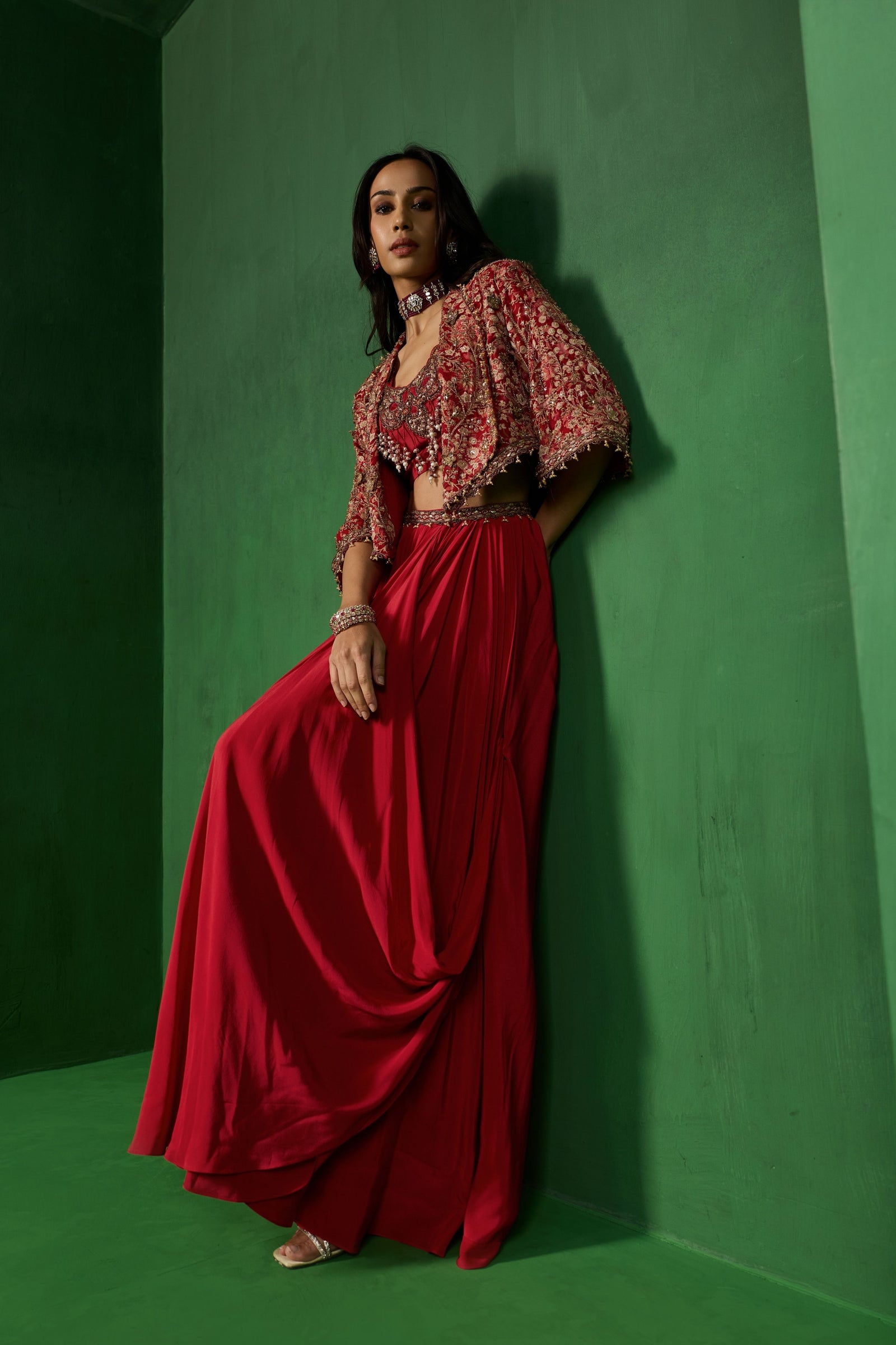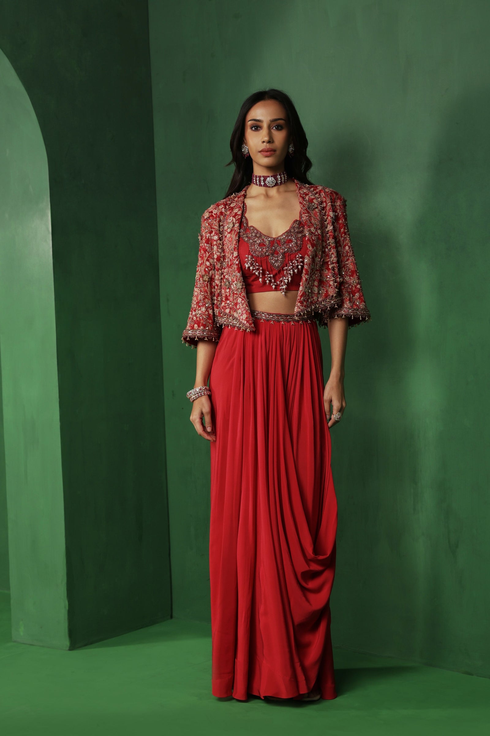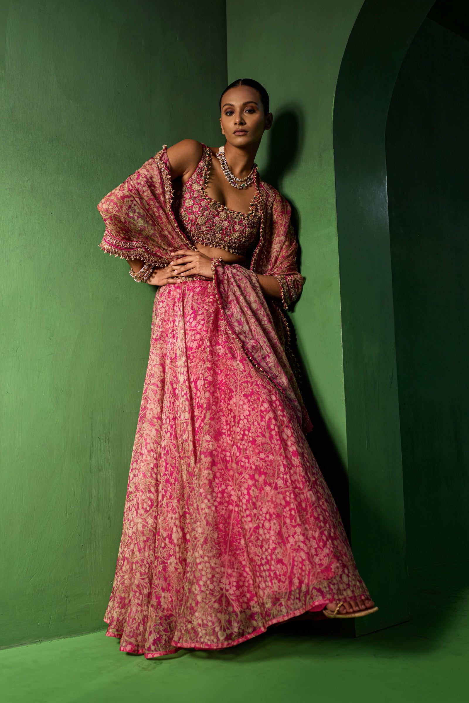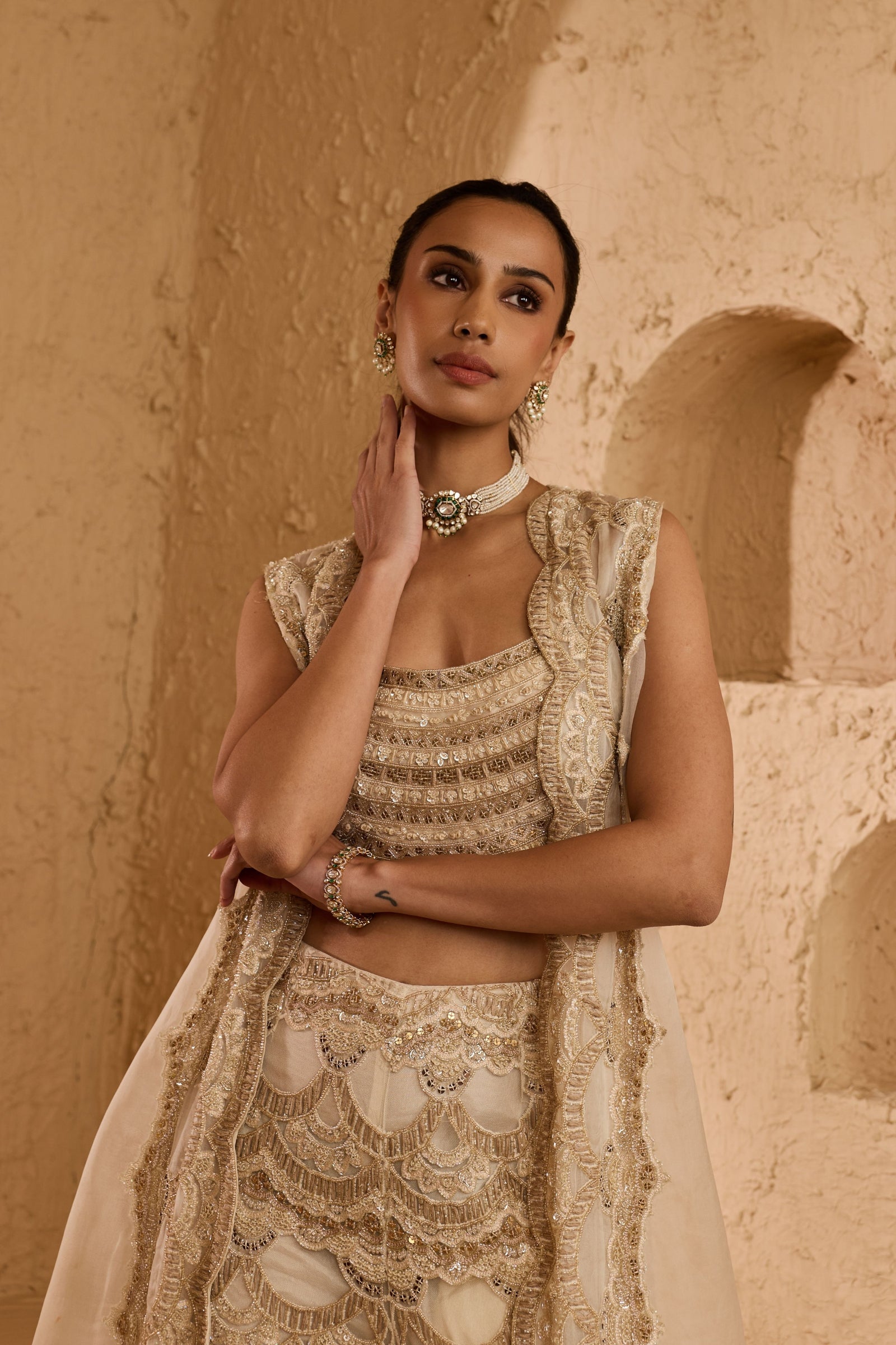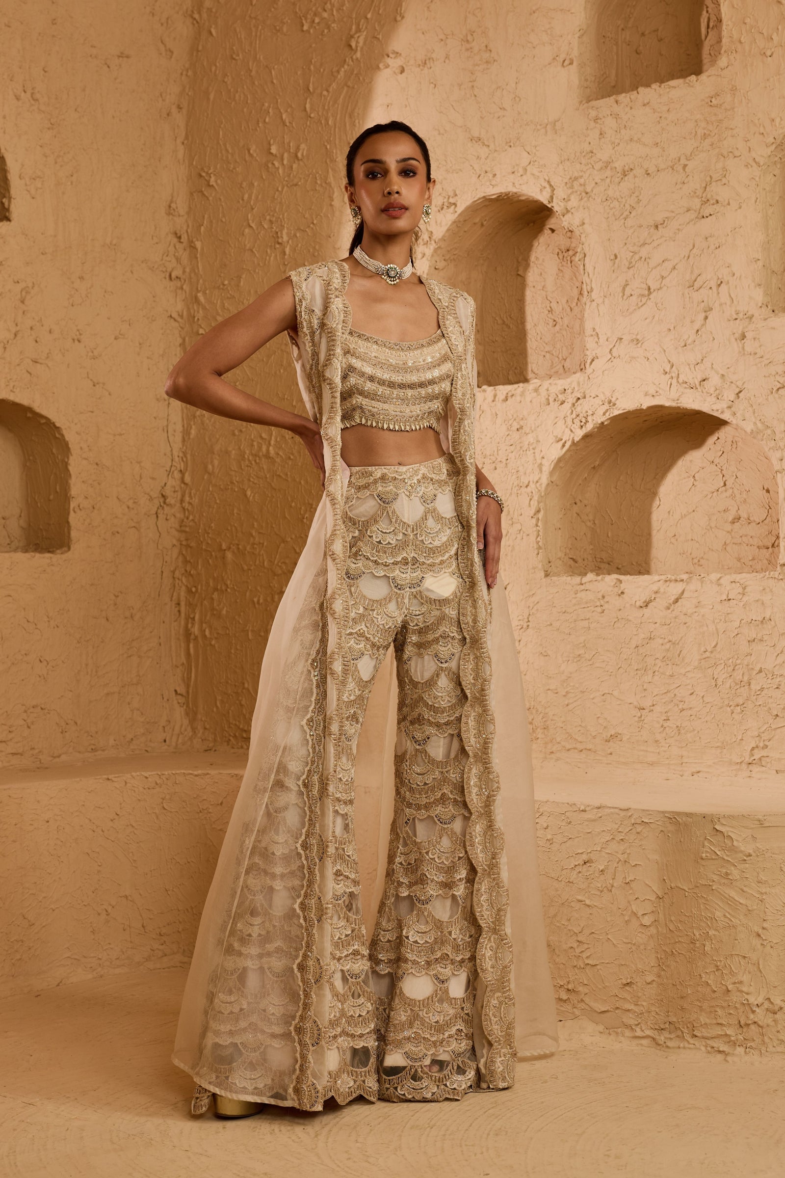 • The Shaha Saree Set captures the beauty of textile artistry with its interplay of light and shadow. The saree, bordered with delicate designs, is paired with a heavily embellished blouse, reflecting the grandeur of Mughal textiles. Crafted from organza and chiffon, this ensemble is a staple to have this festive season.