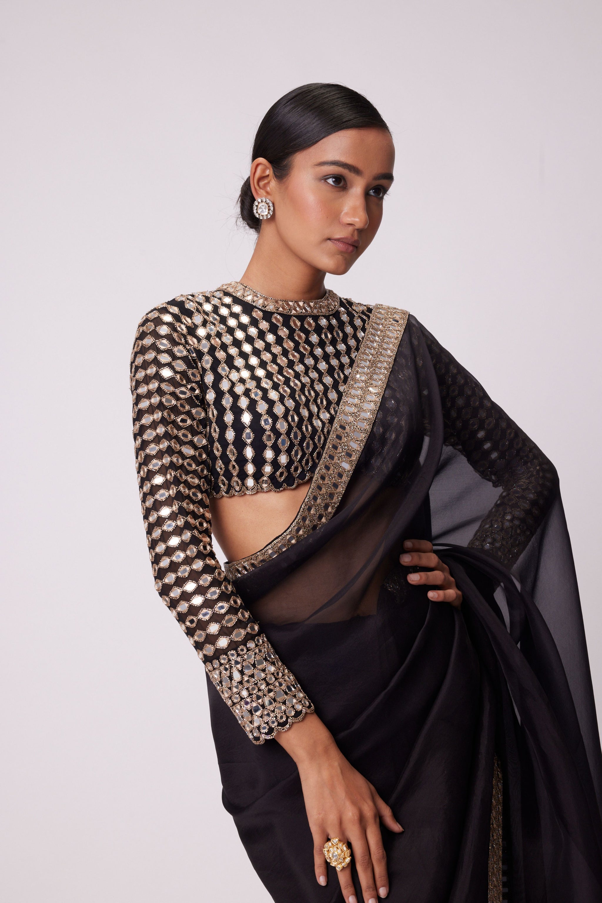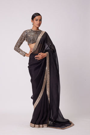 • Black hand embroidered organza saree clubbed with real hand cut mirror embroidered full sleeve blouse.