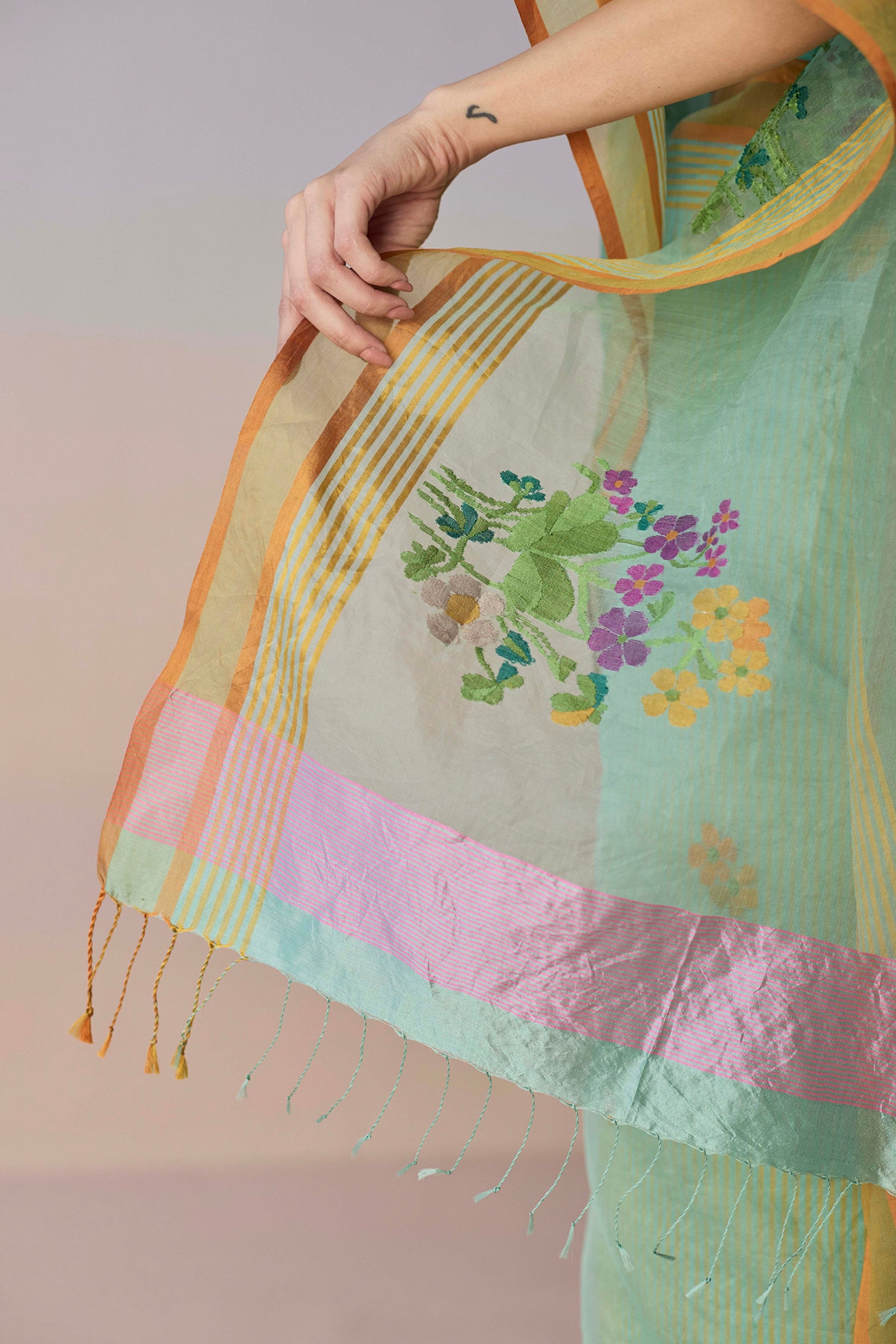 Care: Dry Clean Only. As garments are handmade and handwoven, natural variations in colours and weaves are a characteristic of the textile, and may be found in the finished garments as well.