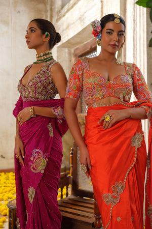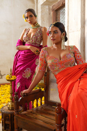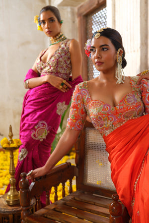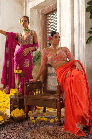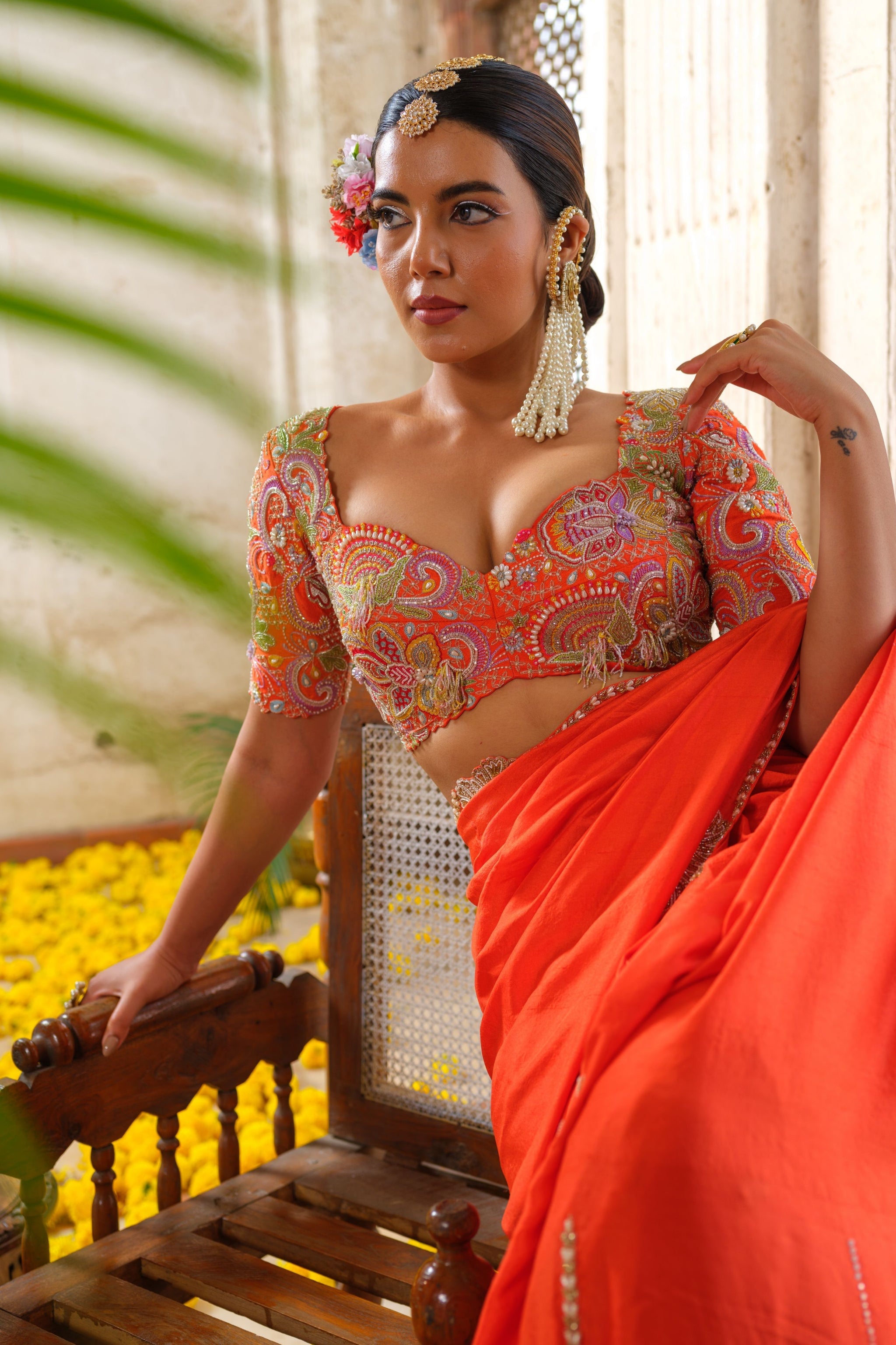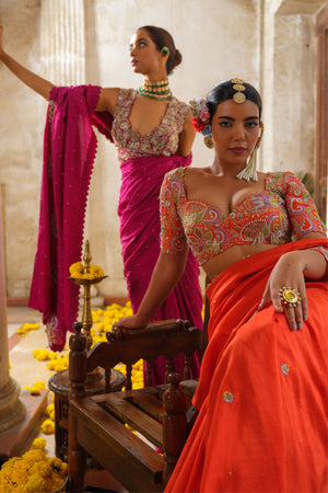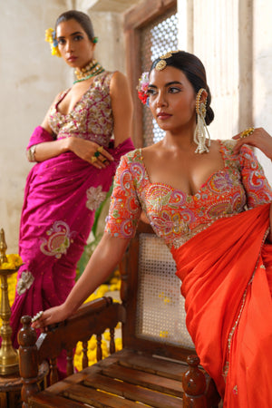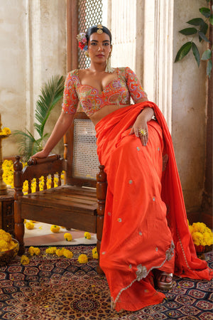 • Six yards of elegant orange silk saree with our signature hand embroidery in resham, zari , pearl and kardhana paired with our orange raw silk elbow sleeves blouse with all over dainty embroidery.