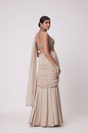 • Light beige georgette pre draped saree with real hand cut mirror embroidered sleeveless blouse.