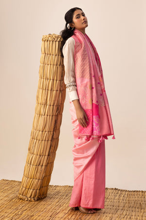 • This is a bandhani patchwork saree on silk that has a unique palla made by using organic shapes of bandhani patches put together using the quilting method. The saree comes with a bandhani on silk blouse piece in pink.