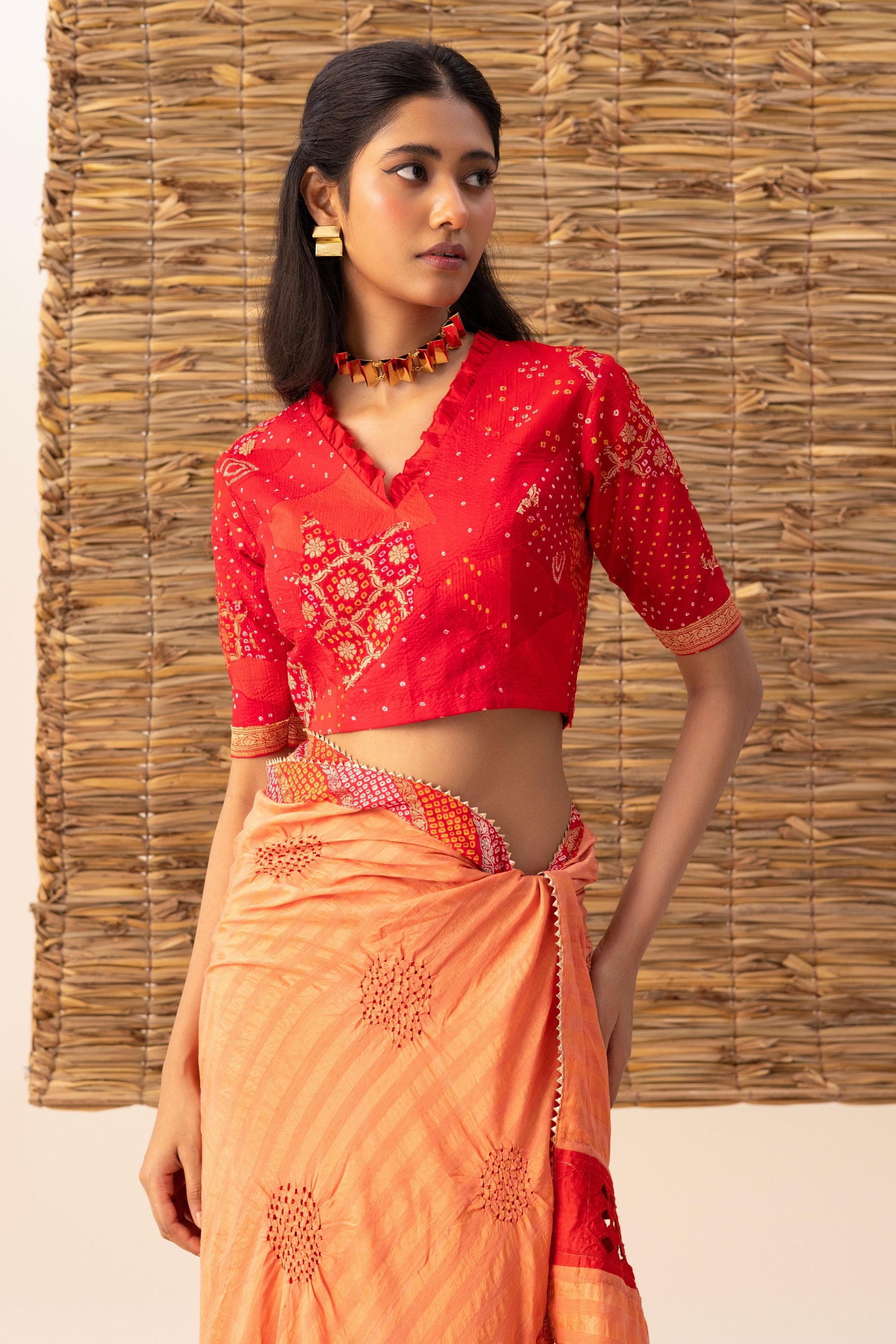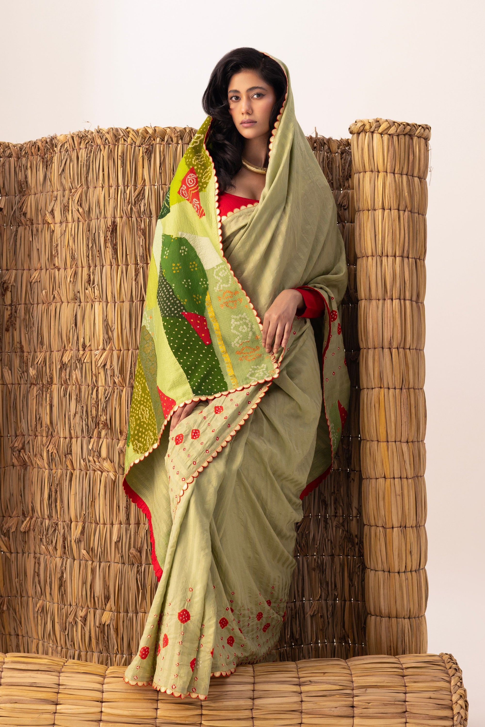 • This is a full leheriya on linen tissue saree with hand embroidered mirror work on palla and along the border. It comes clubbed with tissue raw silk blouse piece with hand mirror work on front and sleeves.